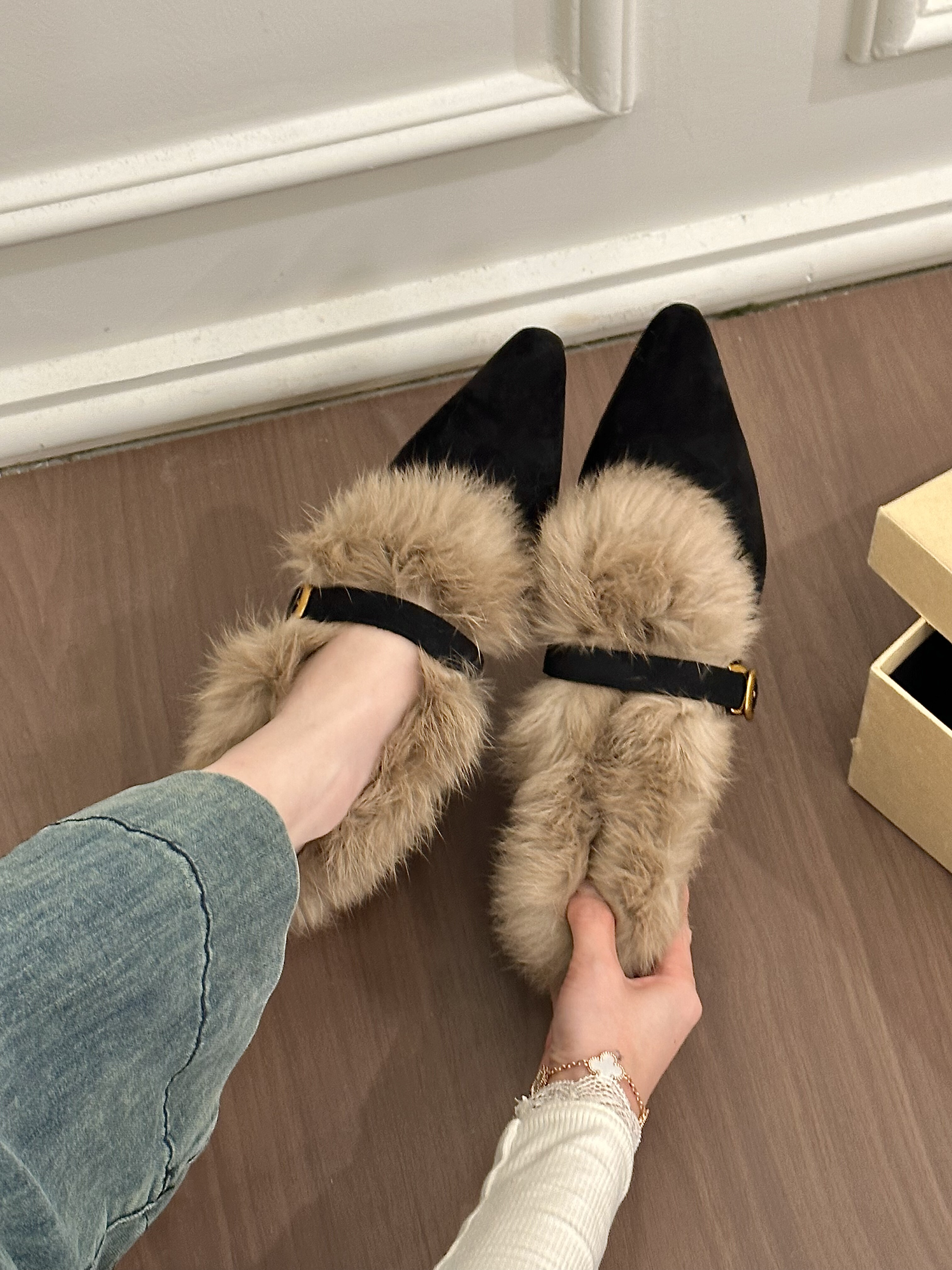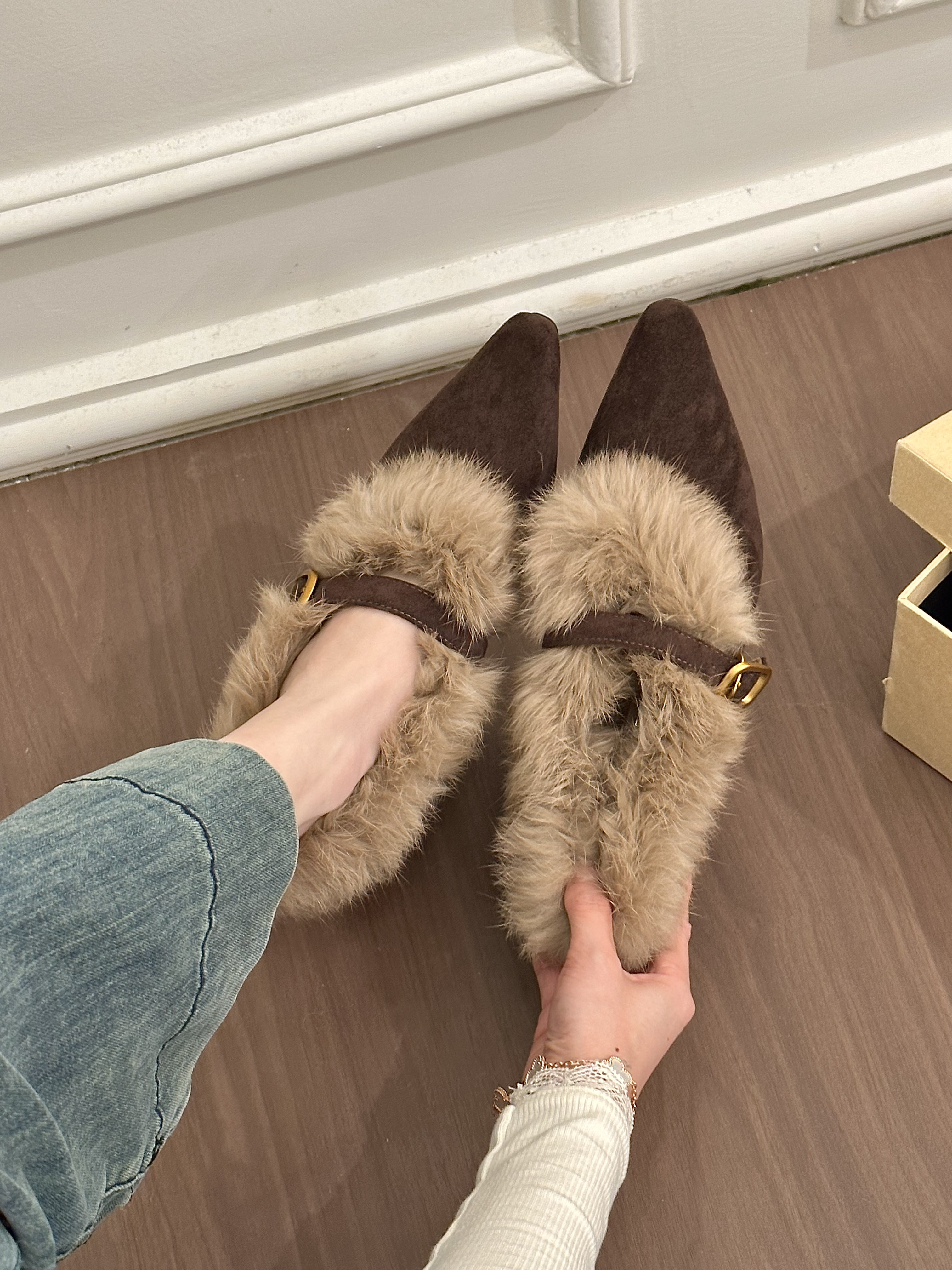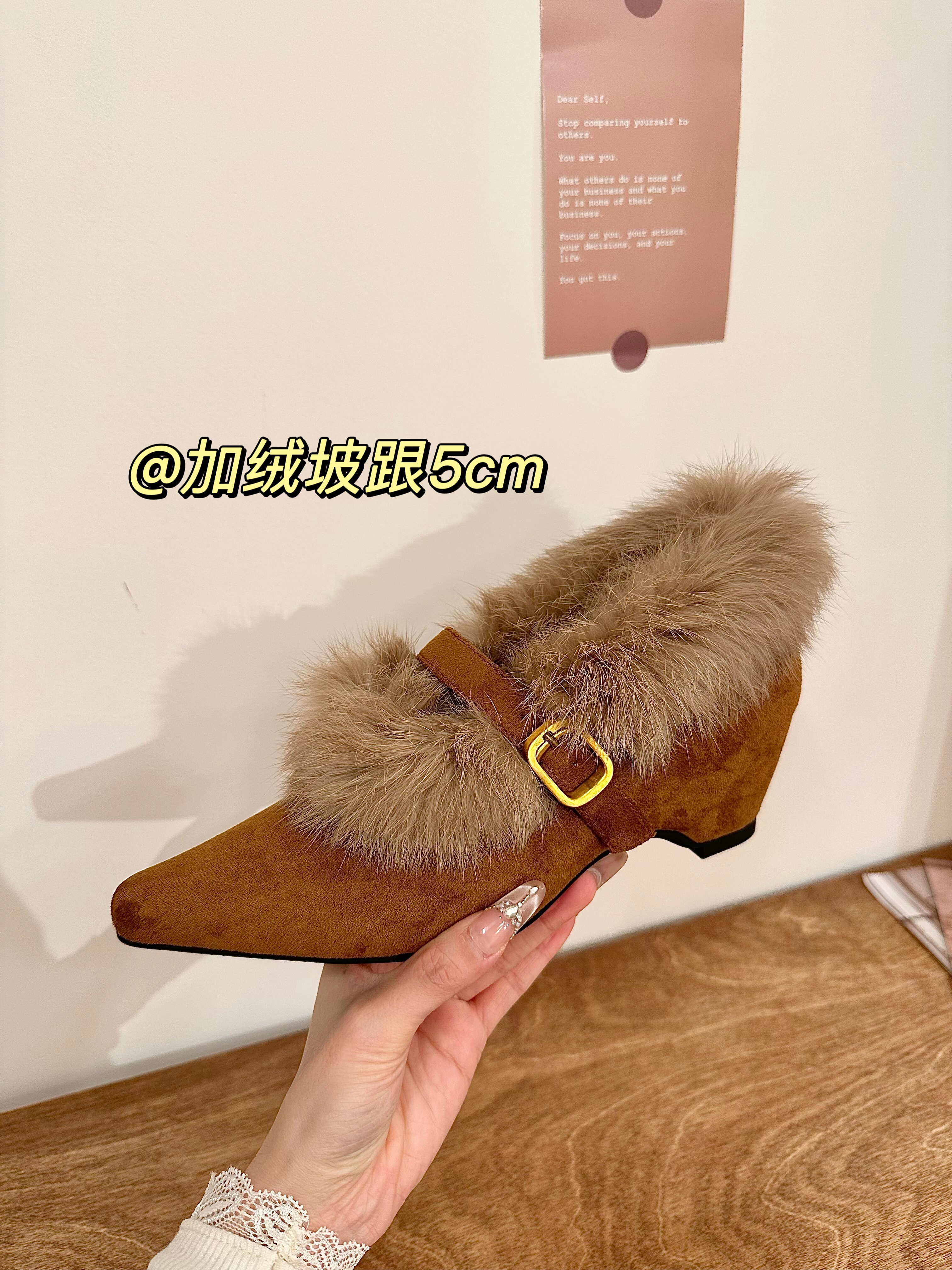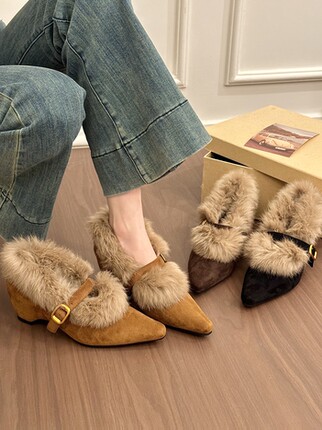 titing老钱系欧尼!复古绒面毛毛边坡跟单鞋女冬韩版搭扣加绒单鞋