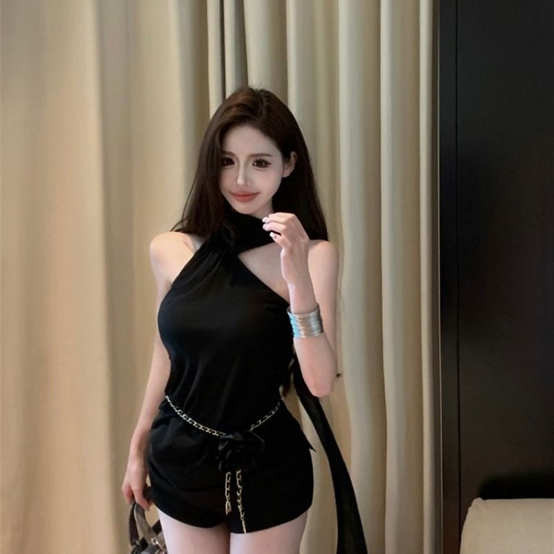 气质飘带修身挂脖吊带小背心女装2024夏季显瘦包臀短裙半身裙套装
