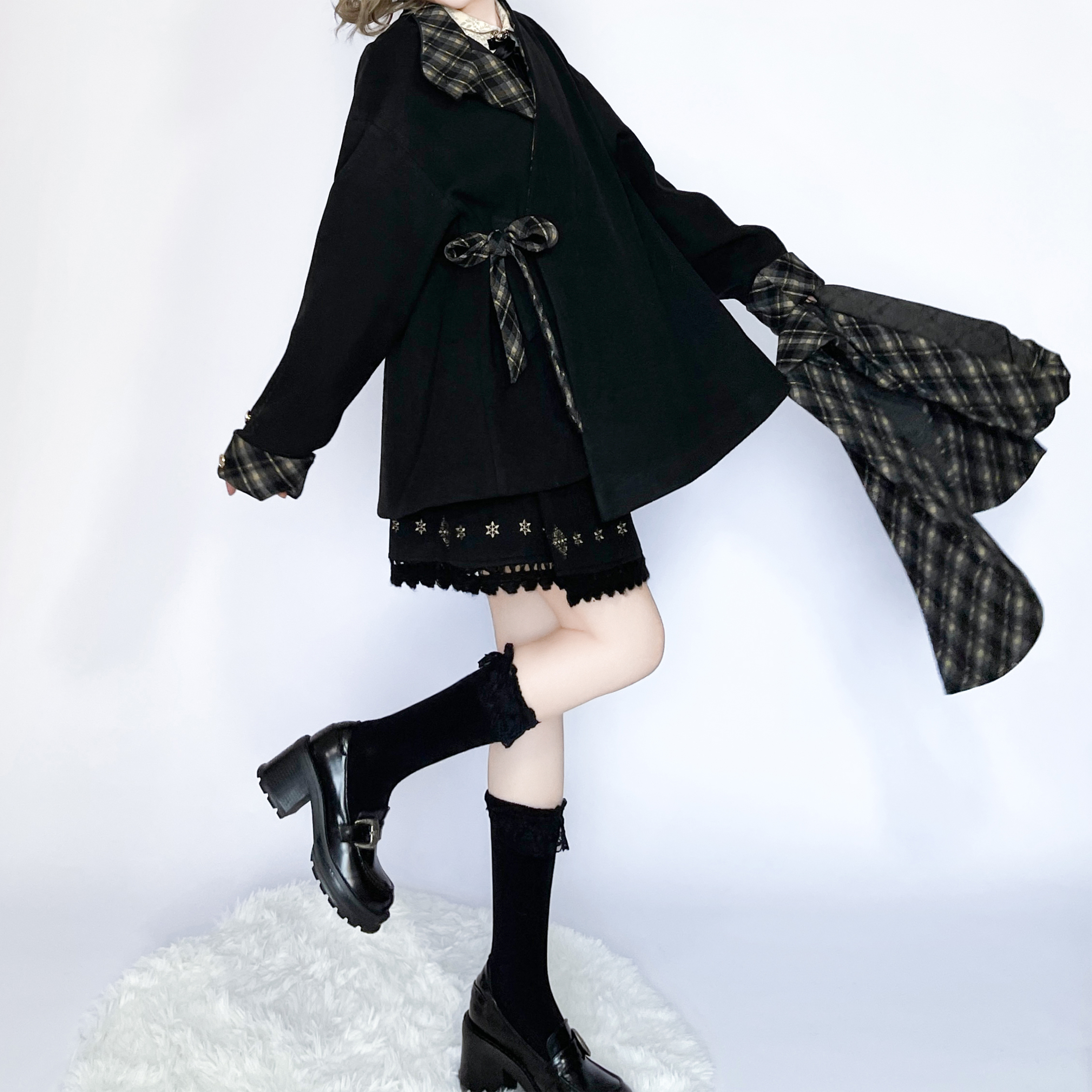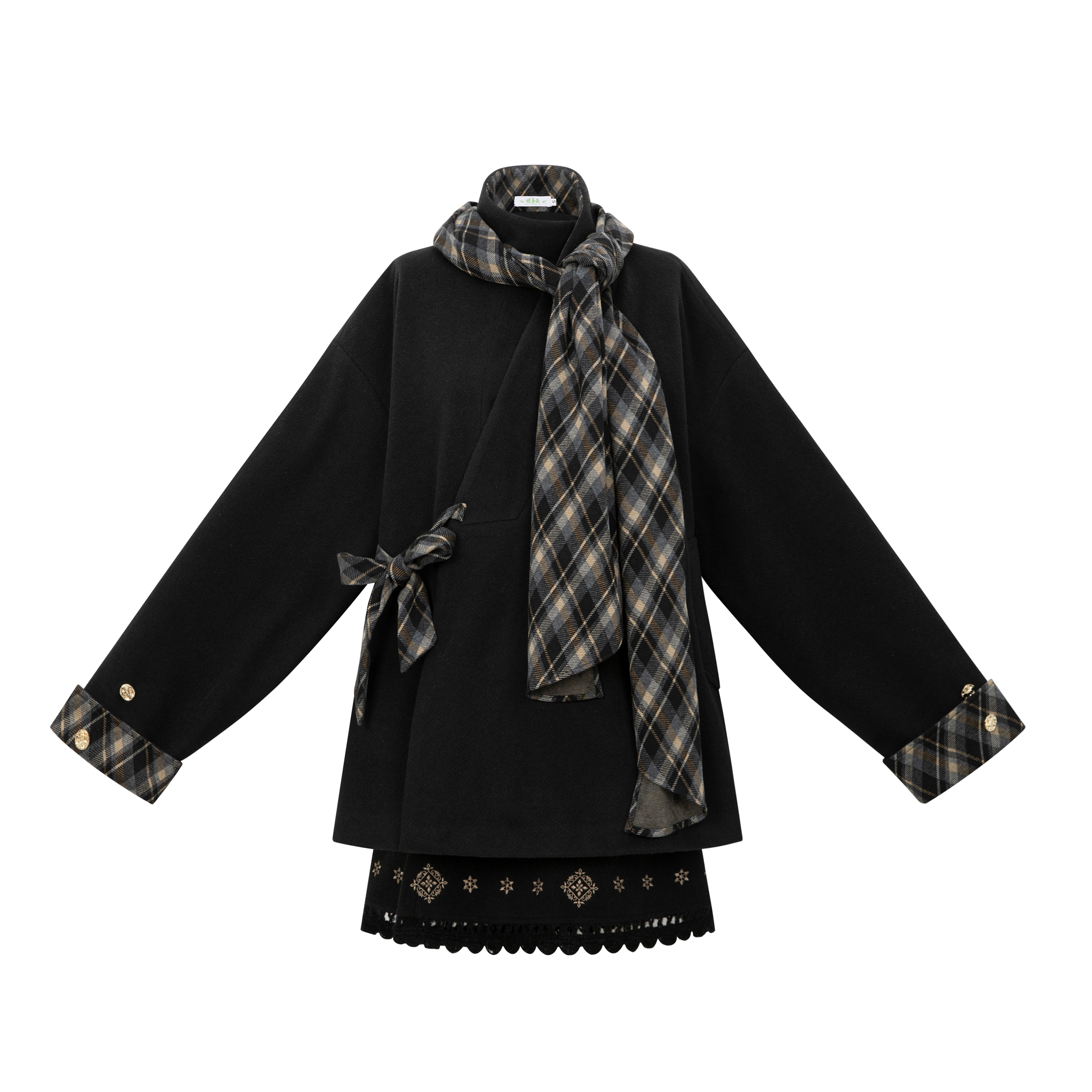 醒春集【魔女】晋制汉服元素曲领大衣短裙毛呢绣花黑色格纹日常风