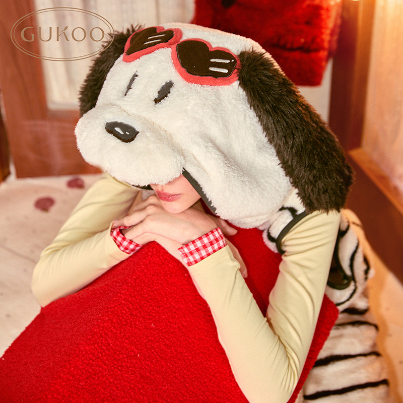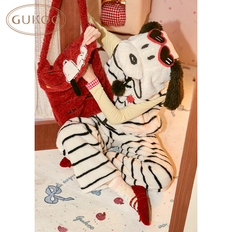 Gukoo/果壳睡衣女冬款加绒史努比黑白条纹连帽马甲居家服套装