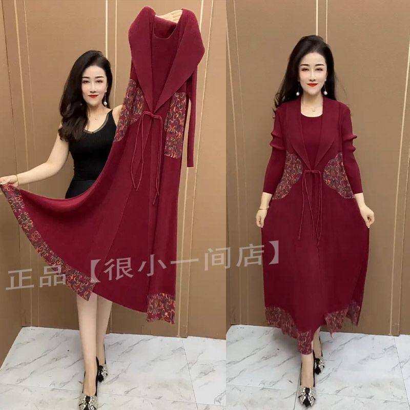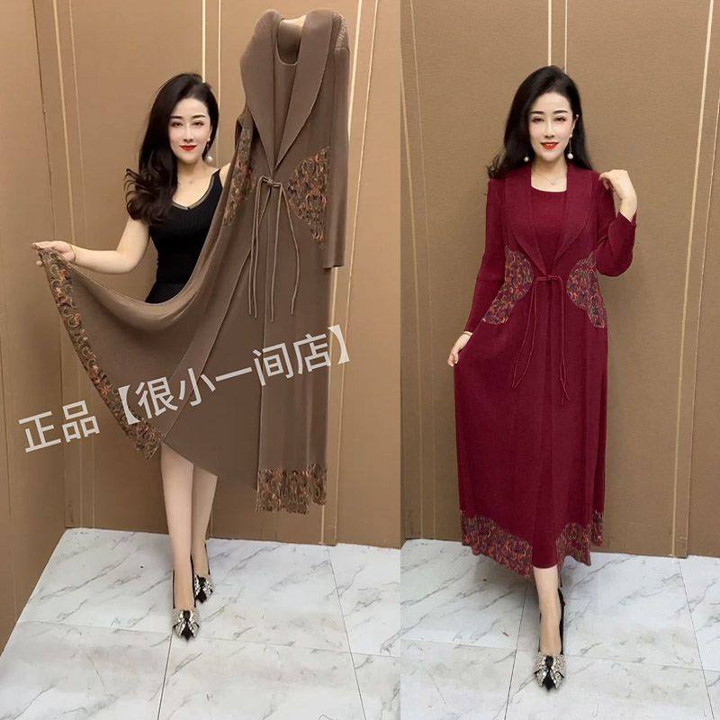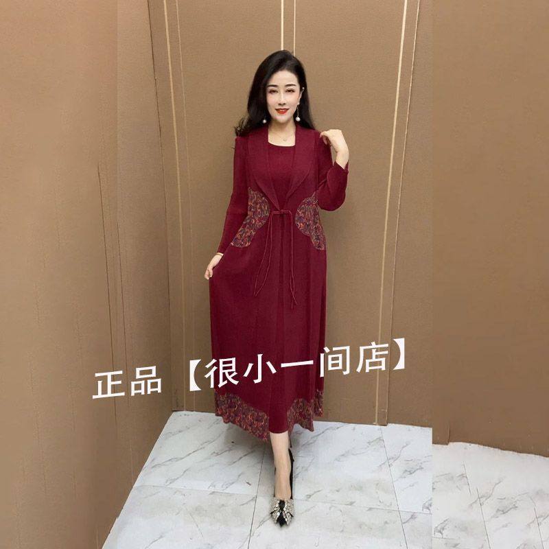 中年妈妈时尚民族风假两件外套2025新款收腰显瘦遮肚长款风衣裙女