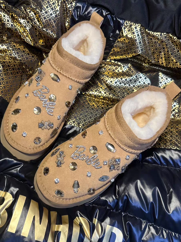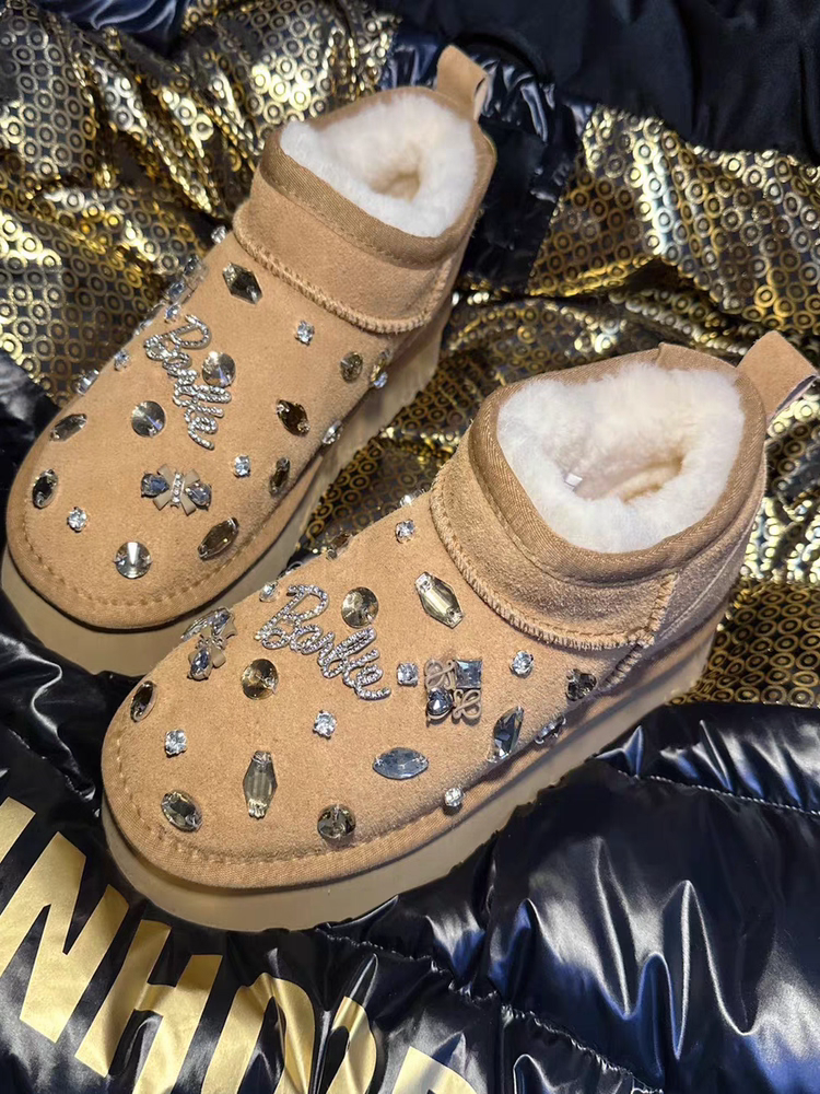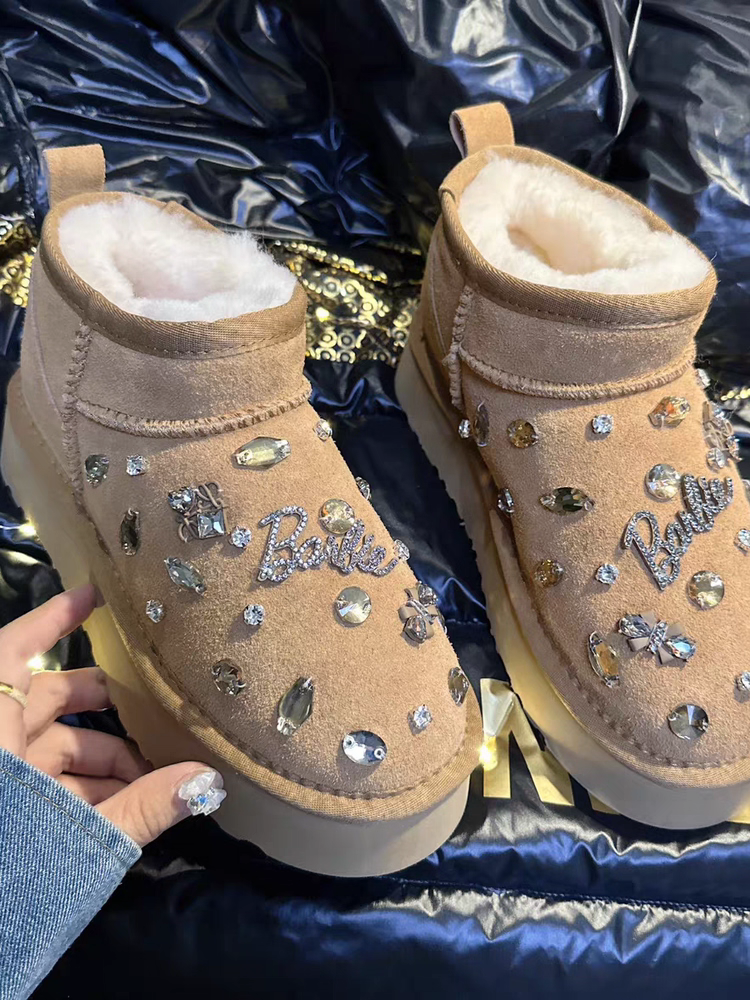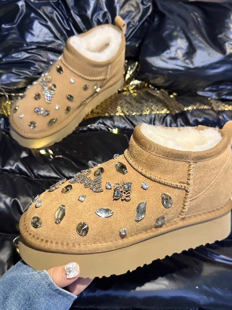 雪地靴女欧洲站重工水钻厚底雪地棉鞋真皮羊毛短靴时尚百搭潮爆款