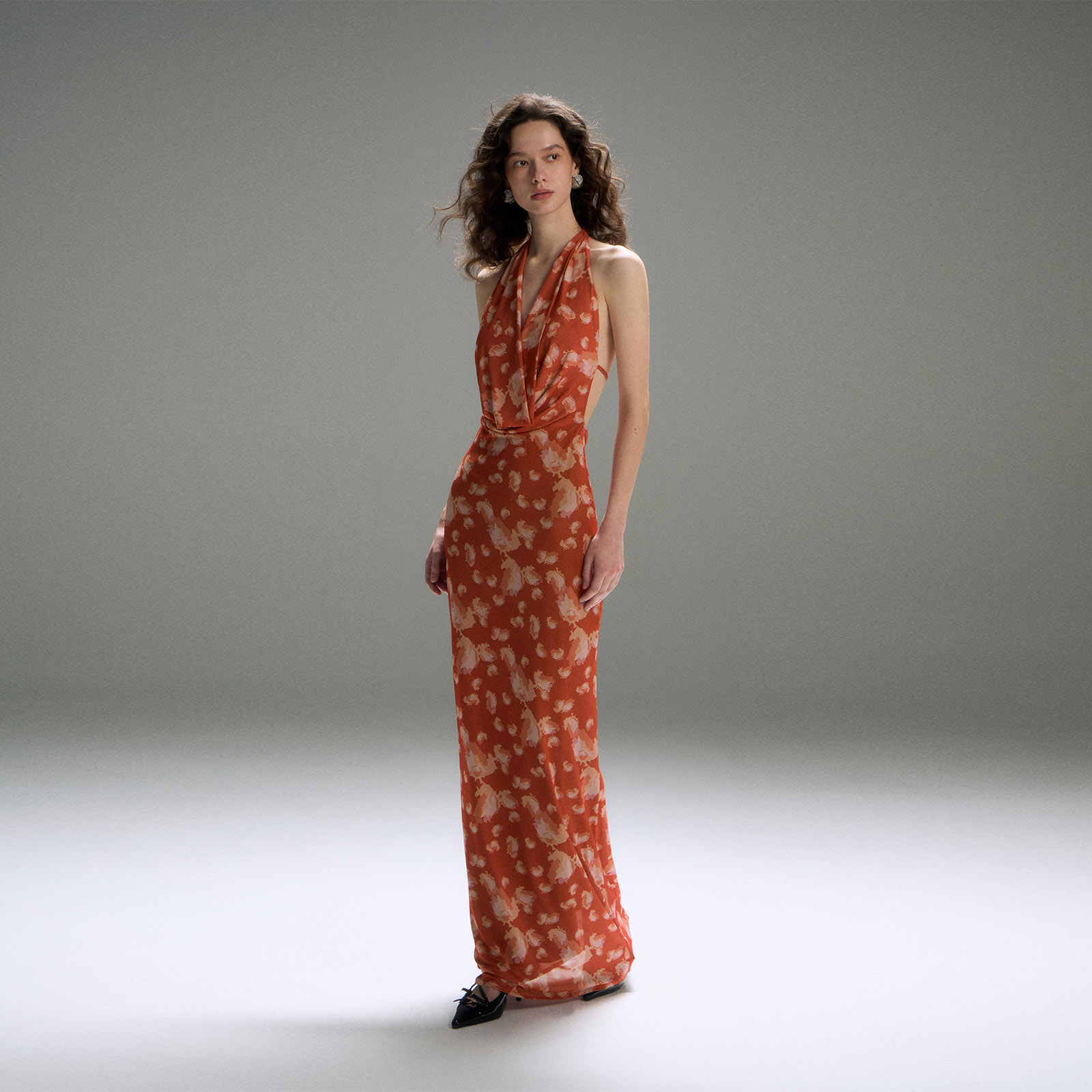 PynkiSwear 红色印花挂脖荡领大露背长裙女修身高智开叉连衣裙