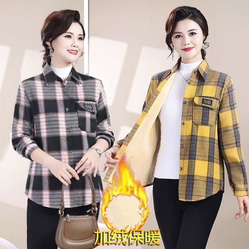 中老年女装妈妈春秋装加绒格子衬衫外套长袖宽松新款百搭衬衣外套