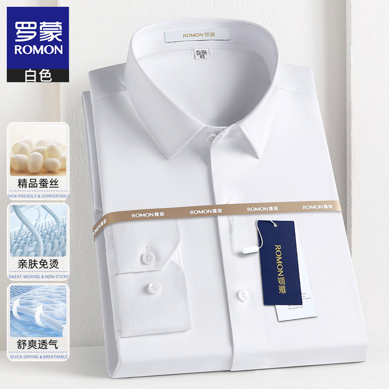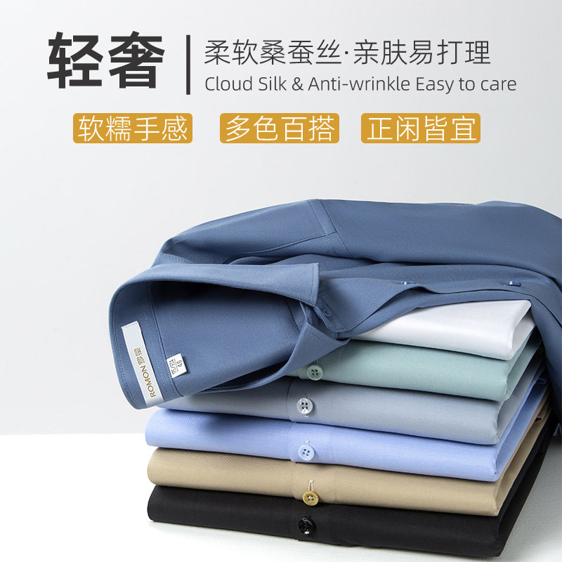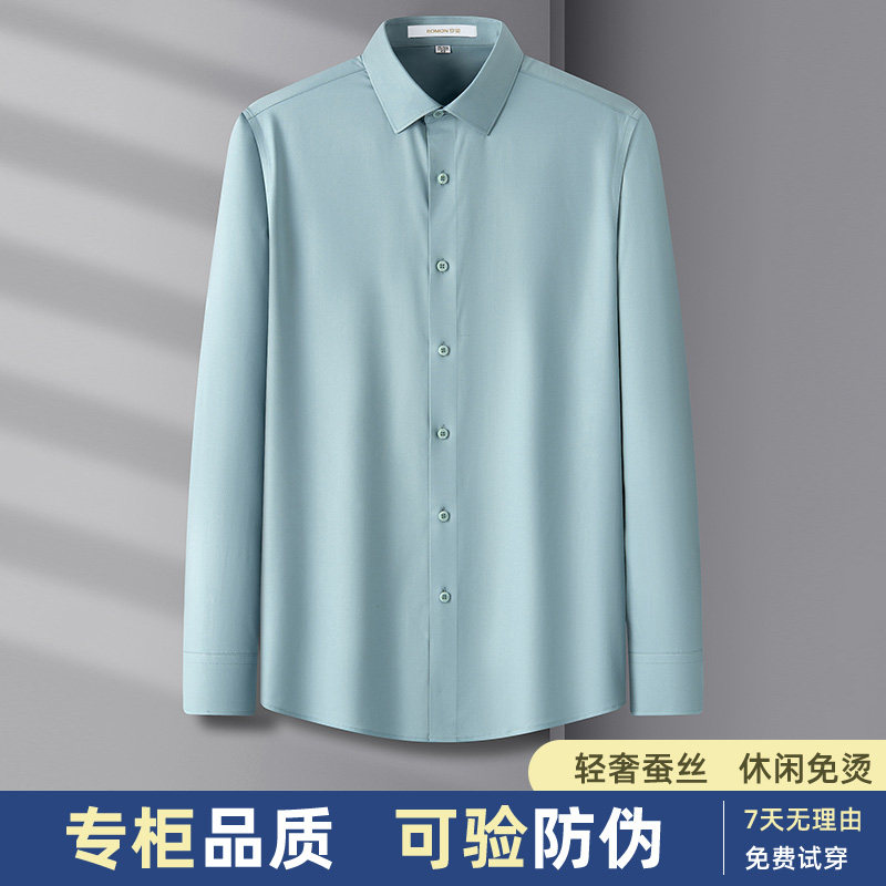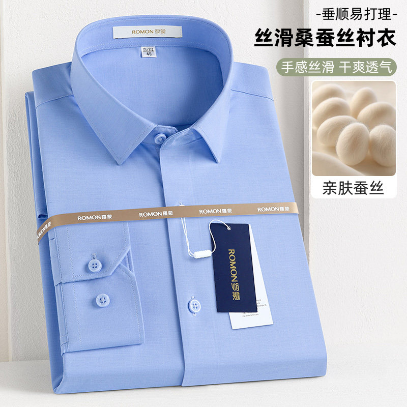 罗蒙男士高端桑蚕丝长袖衬衫2024春秋季商务工装休闲免烫衬衣男装