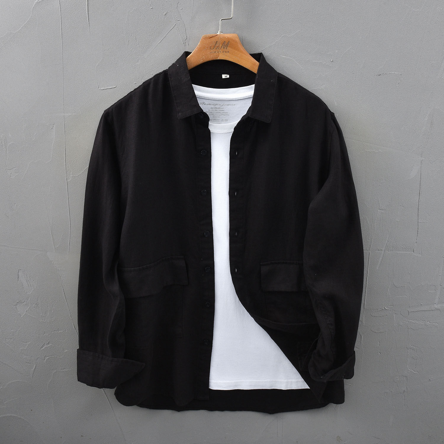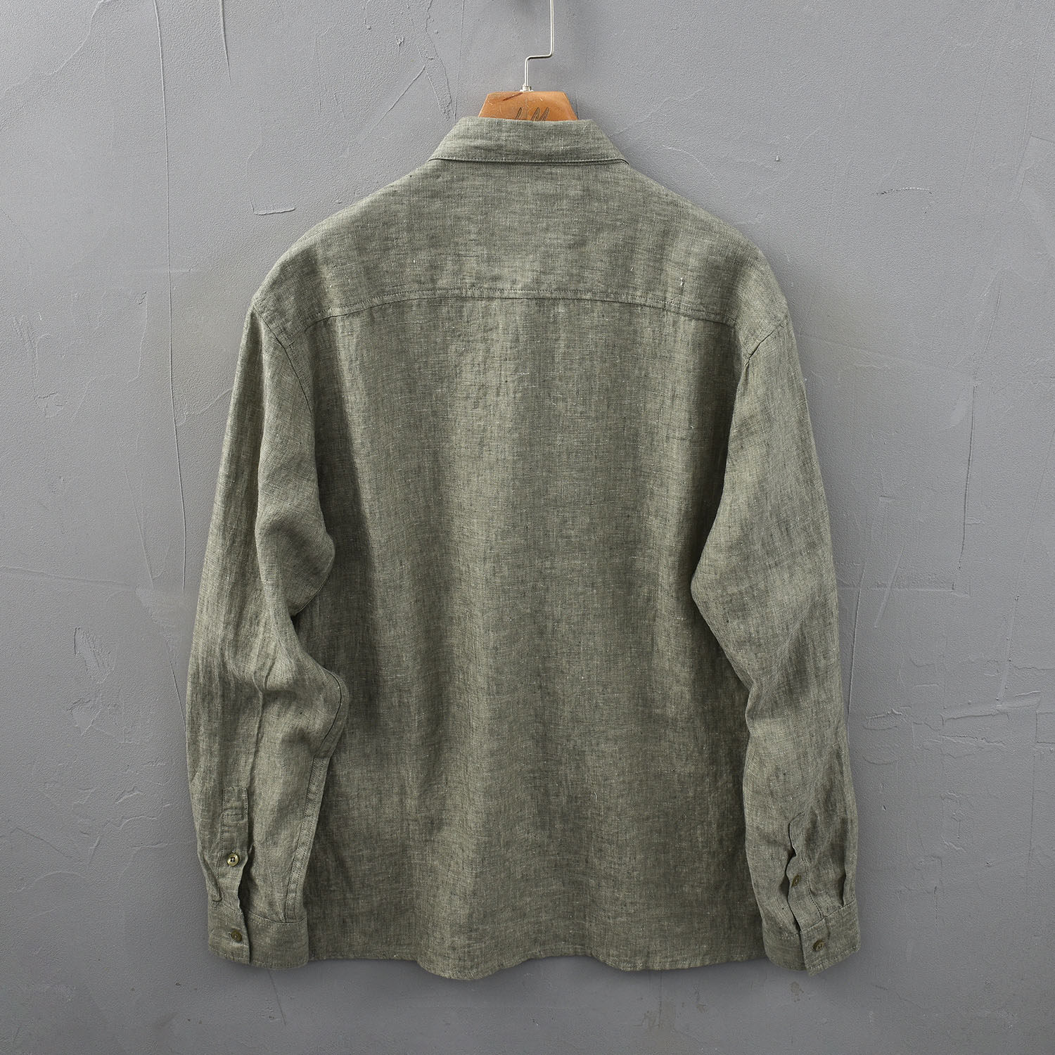 复古色织口袋长袖亚麻衬衫男士