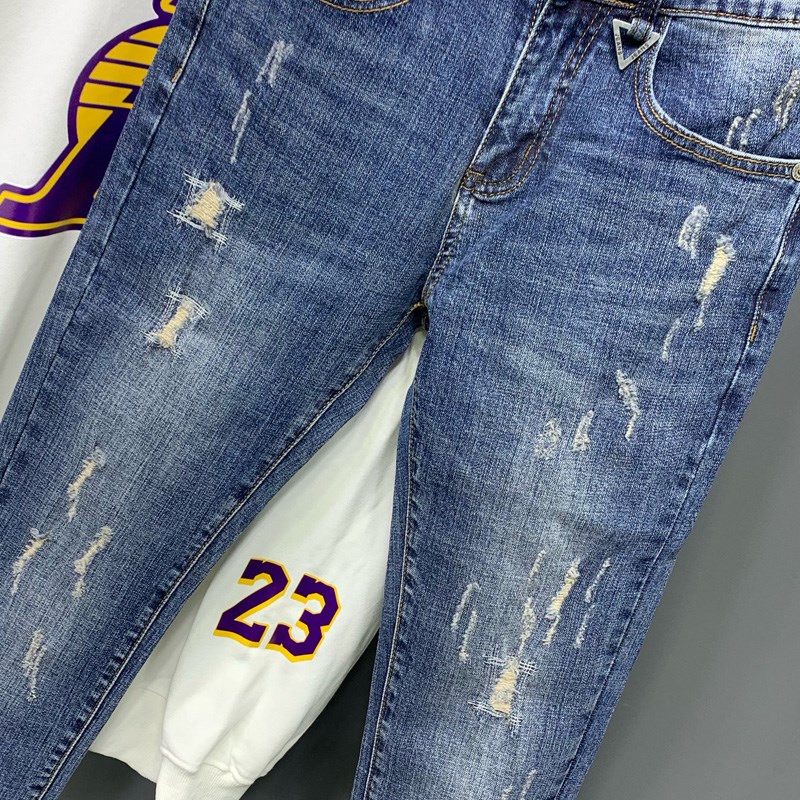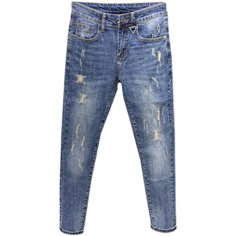 破洞牛仔裤男九分春季新款韩版潮流修身小脚裤时尚刺绣蓝色长裤子