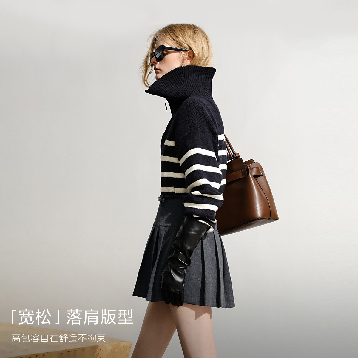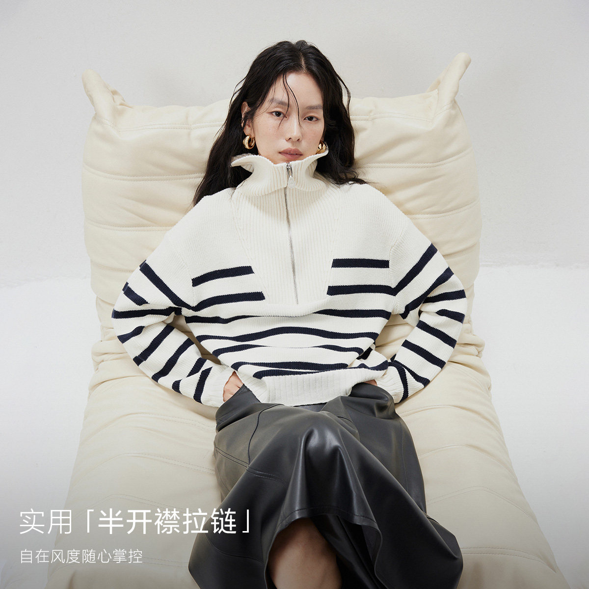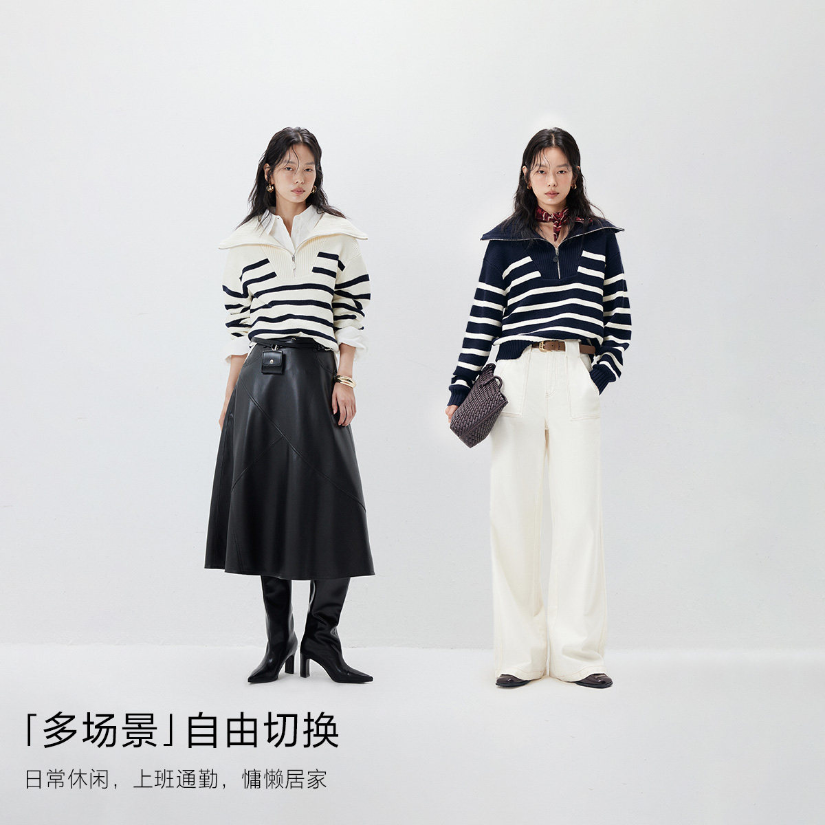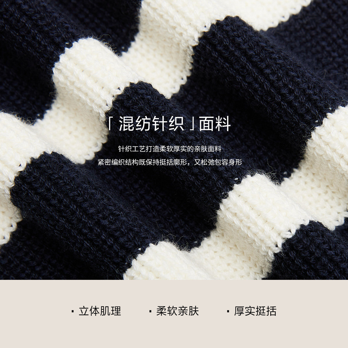 ONLY2025冬季新款海军风半开襟大翻领落肩通勤显瘦条纹针织衫女
