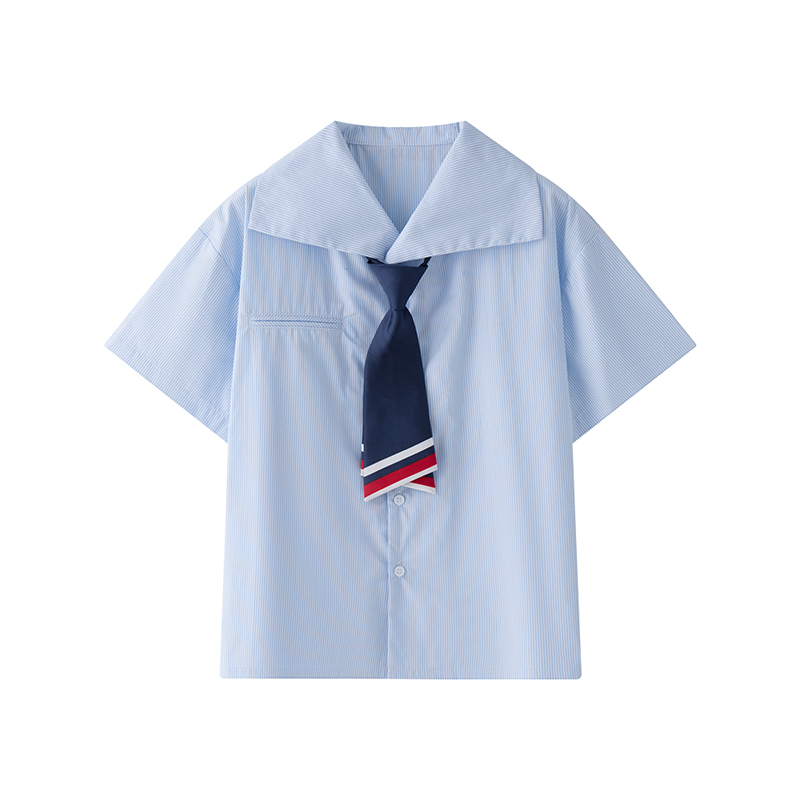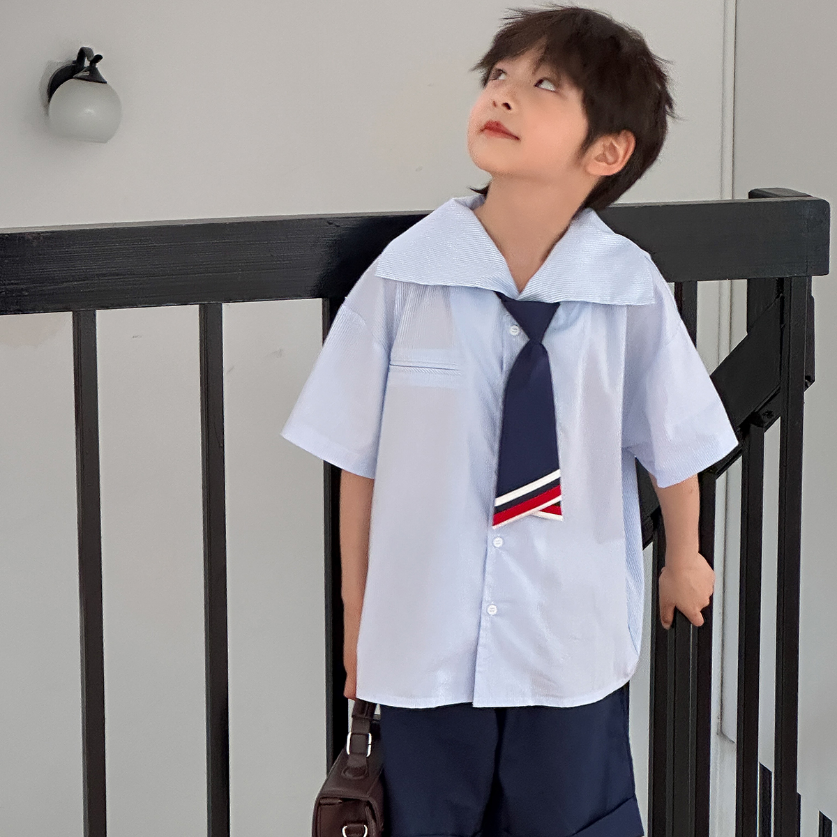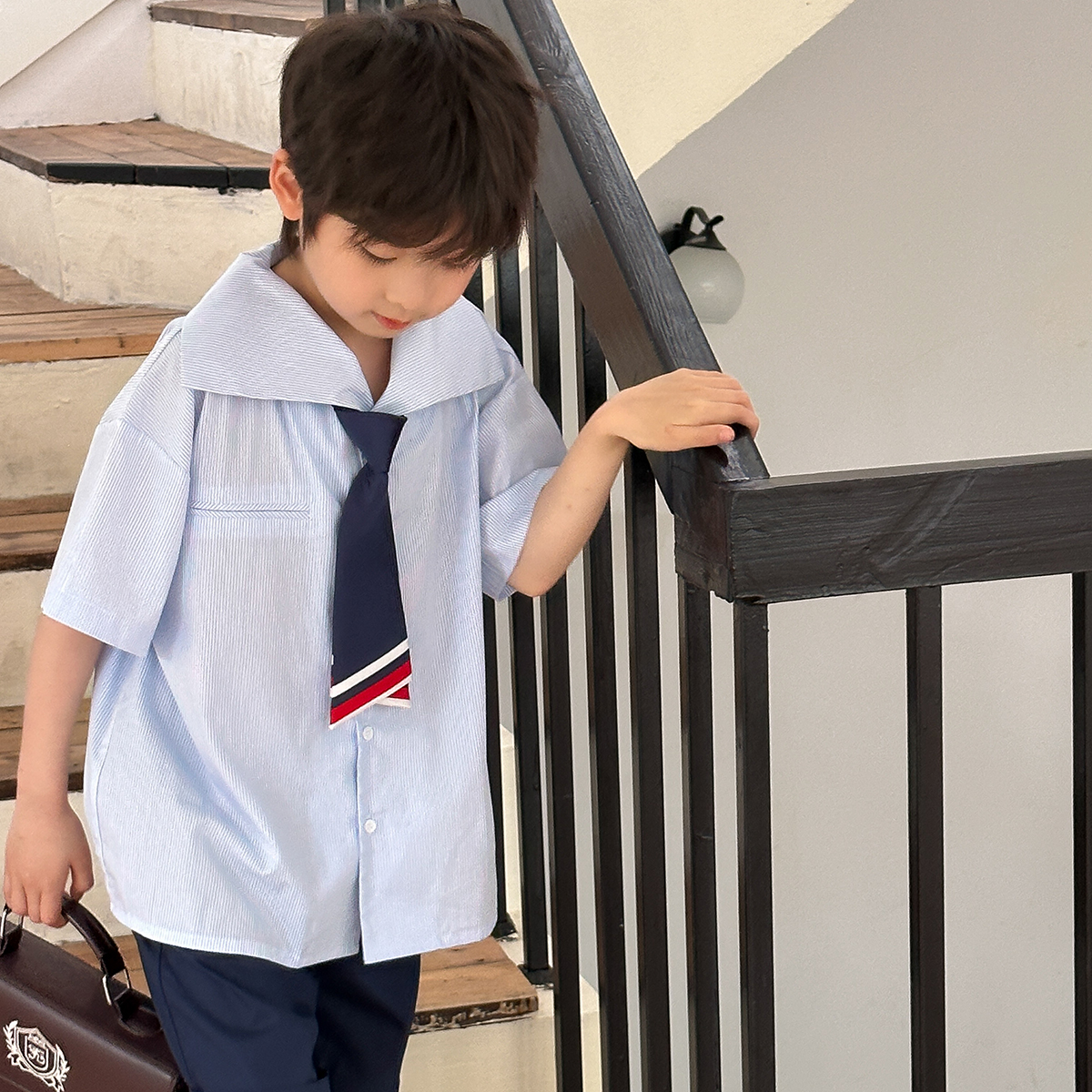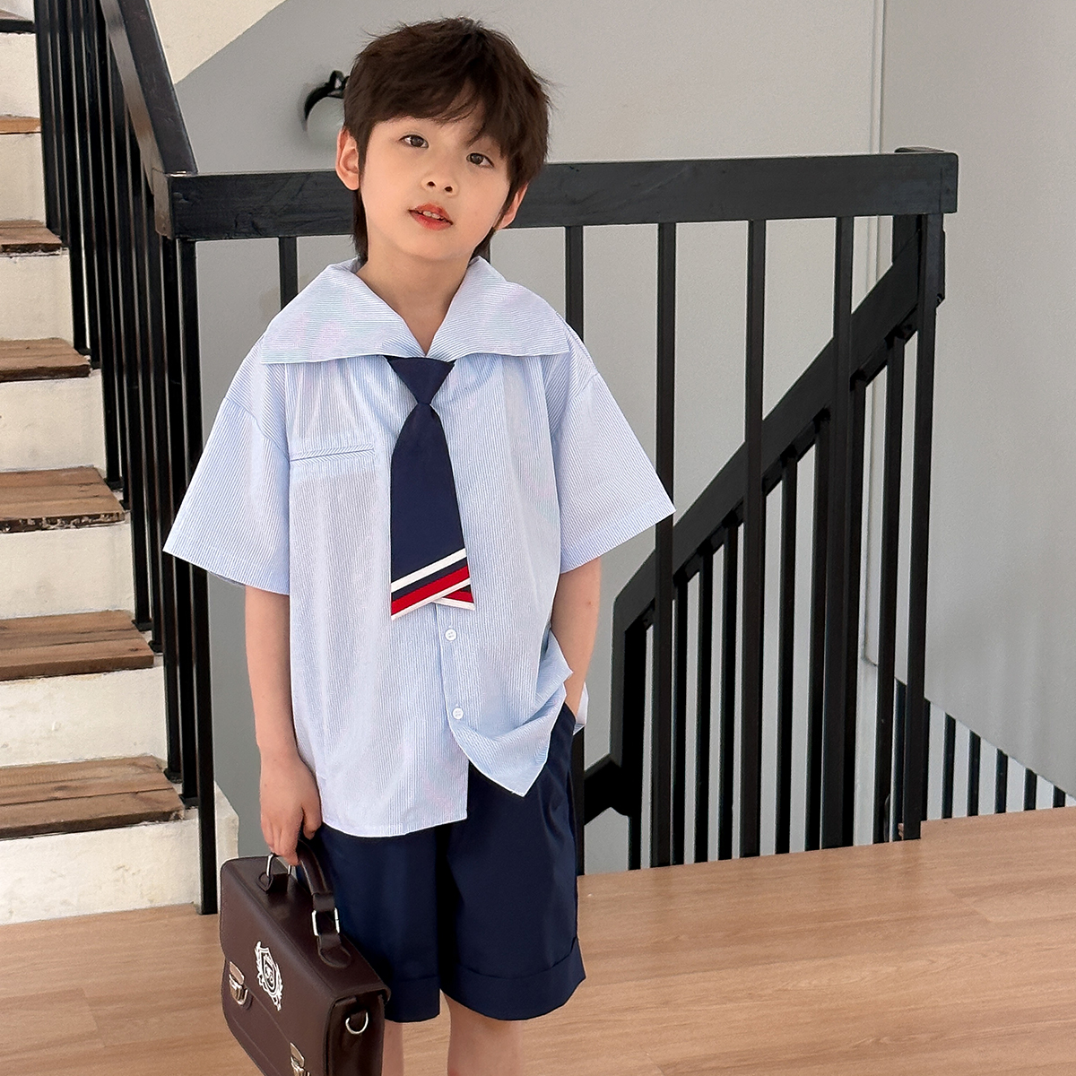 虾酱麻麻男童短袖衬衫套装夏季2025新款中大童海军风条纹儿童短裤
