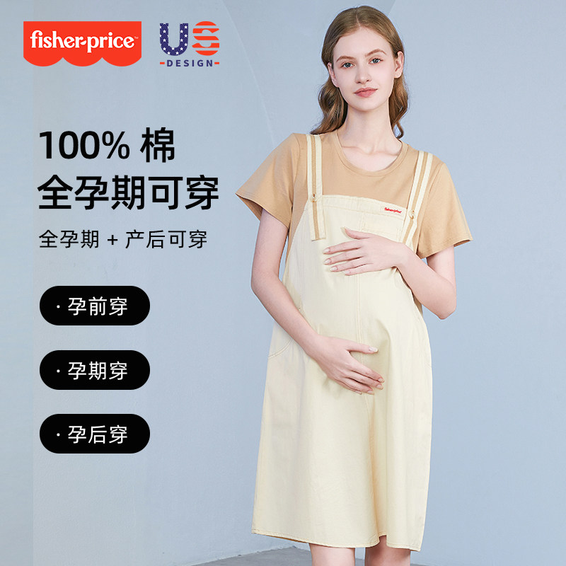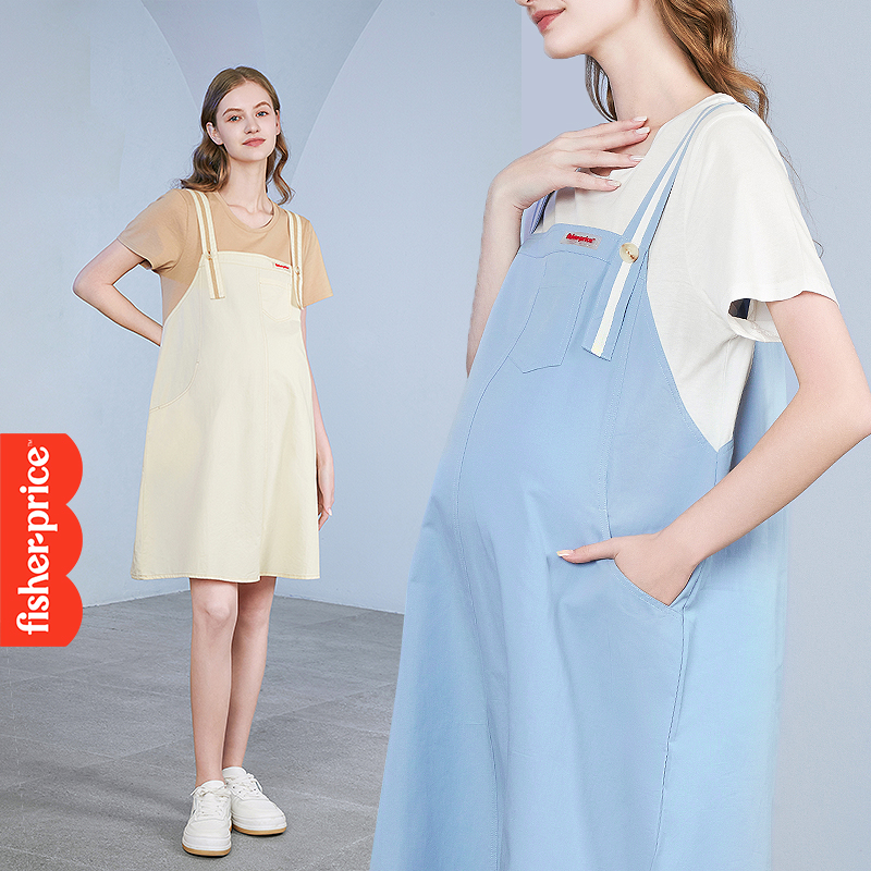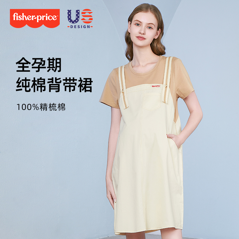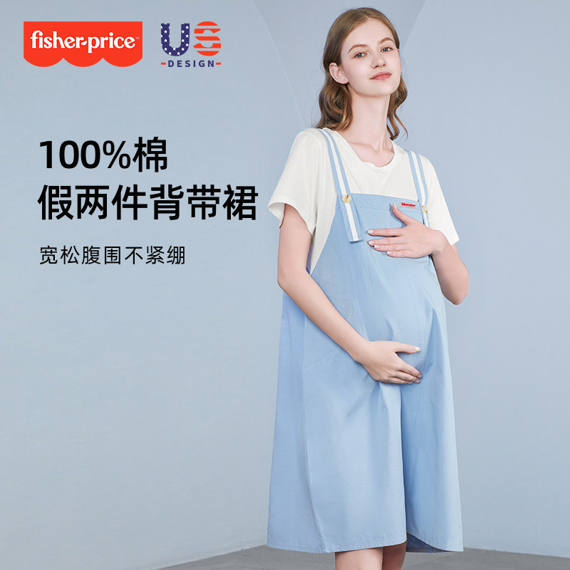美国费雪孕妇2025夏装新款宽松纯棉背带裙假两件连衣裙夏季孕妇裙
