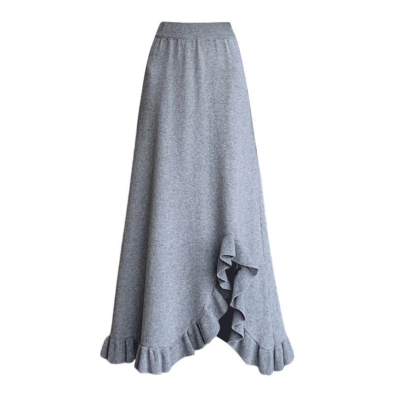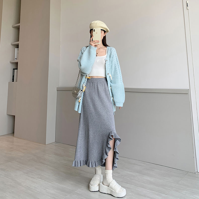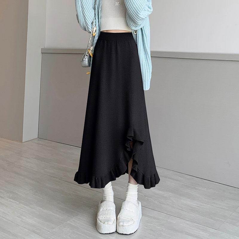 荷叶边半身裙秋冬新款女不规则设计感中长款a字开叉针织包臀裙子