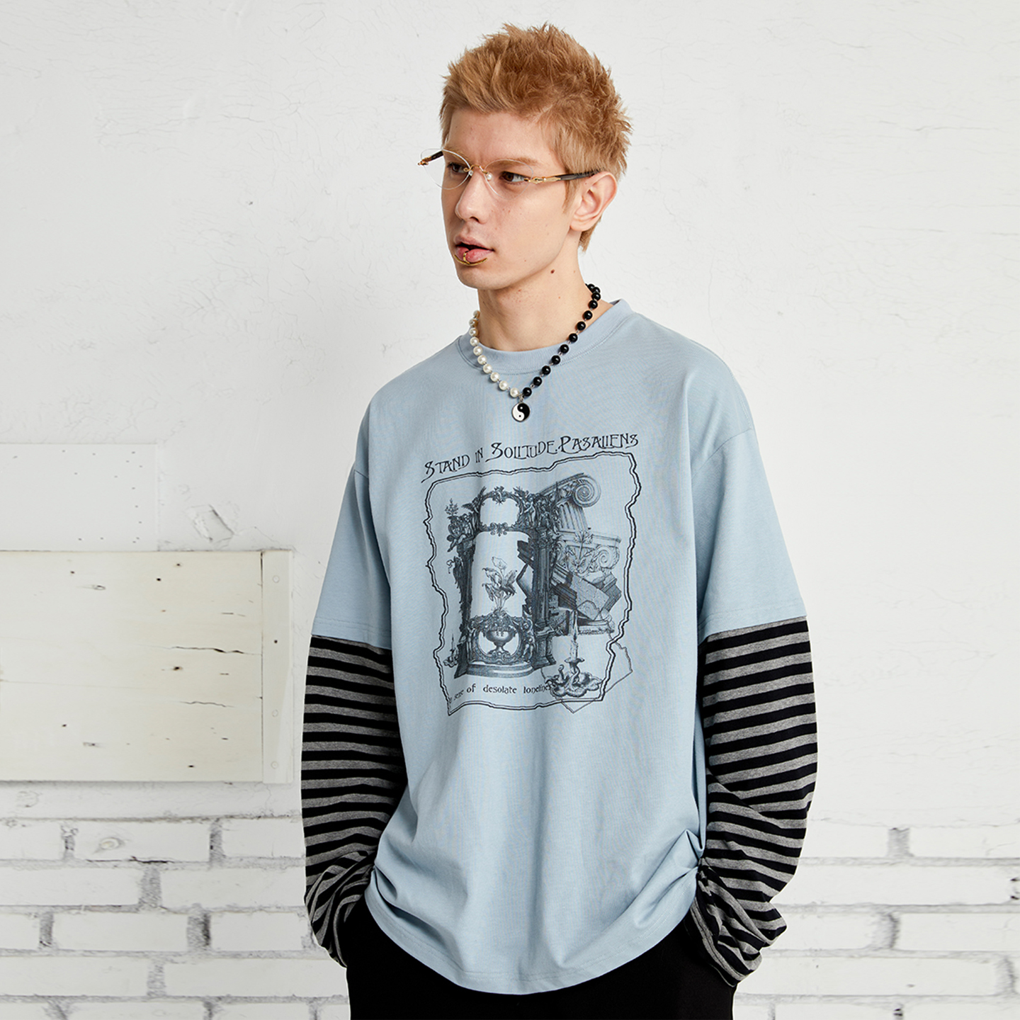 PASALIENS&PASET美式复古废墟印花条纹T恤男假两件拼接长袖上衣