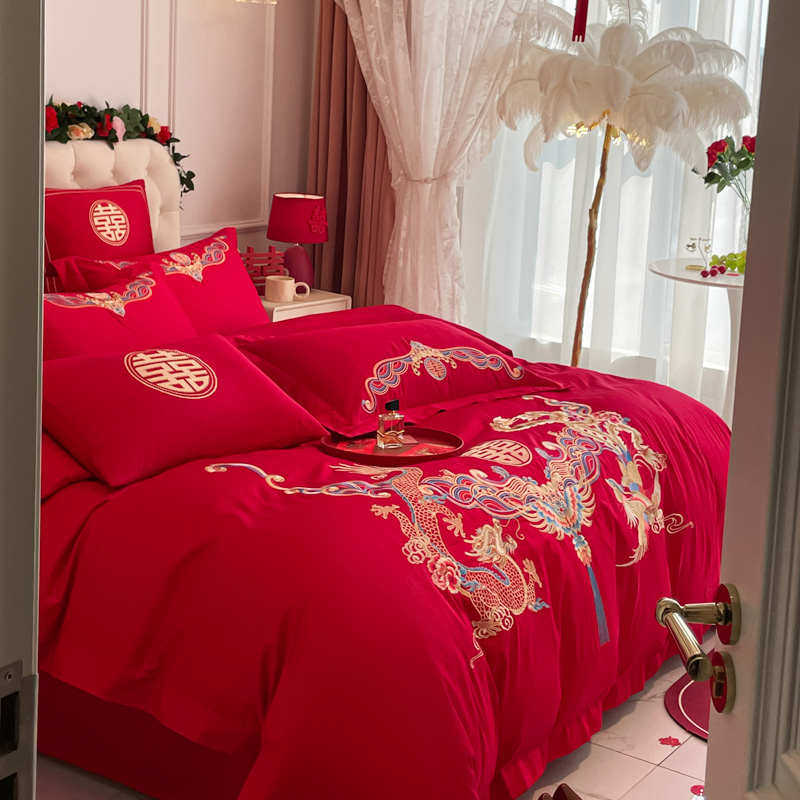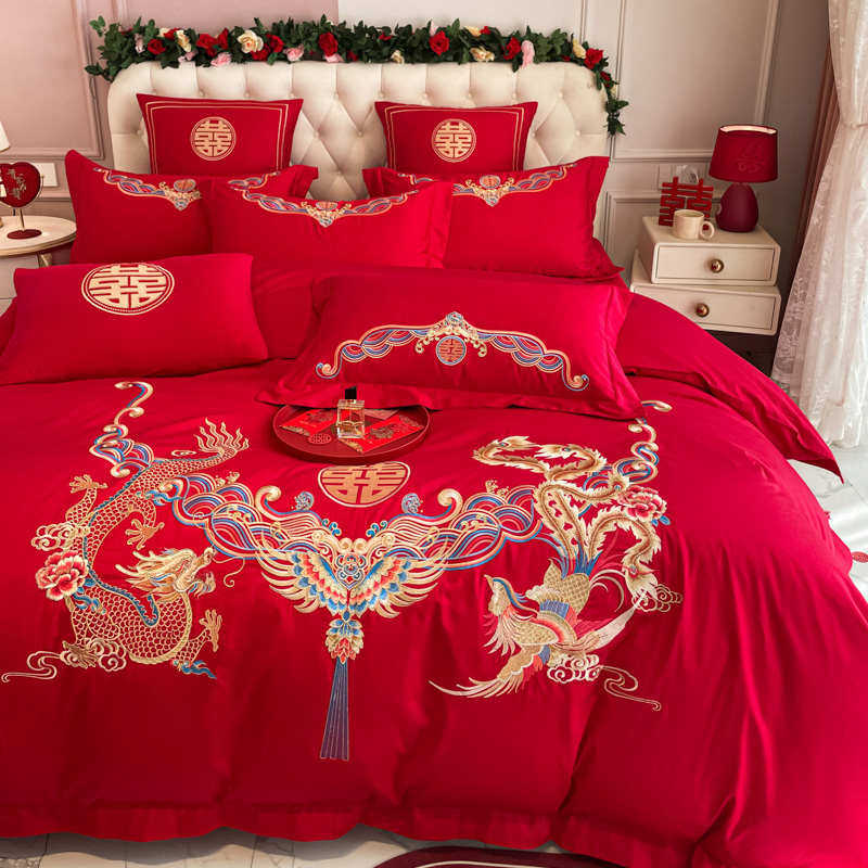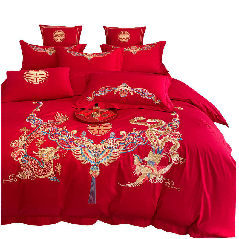 新中式龙凤刺绣160支婚庆四件套大红色喜被纯棉床单结婚床上用品4