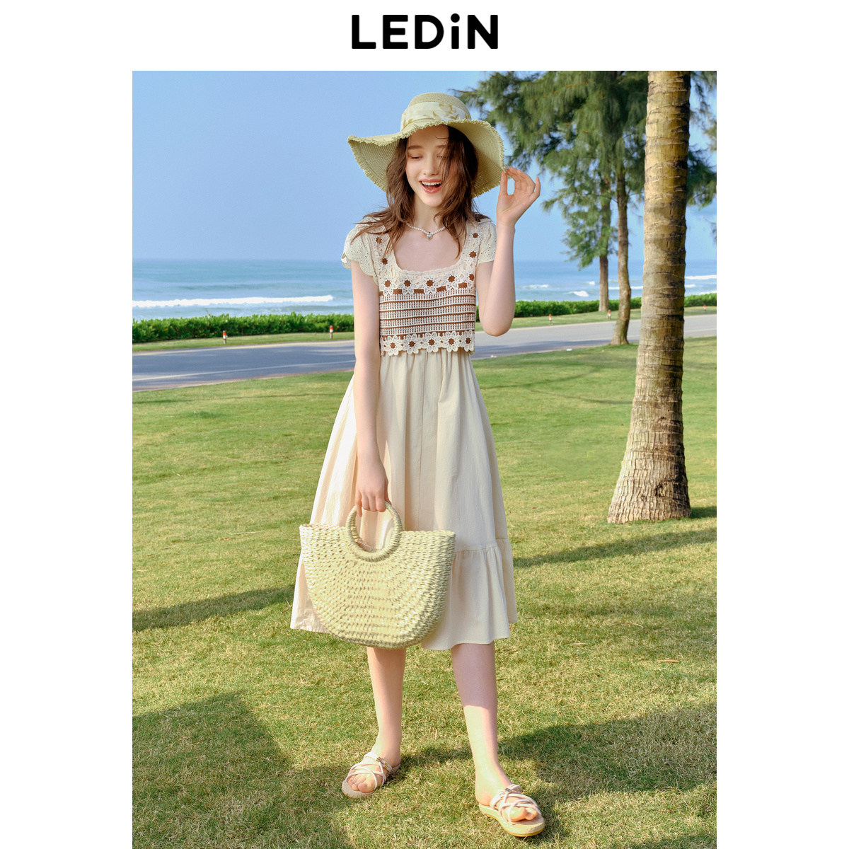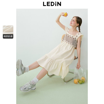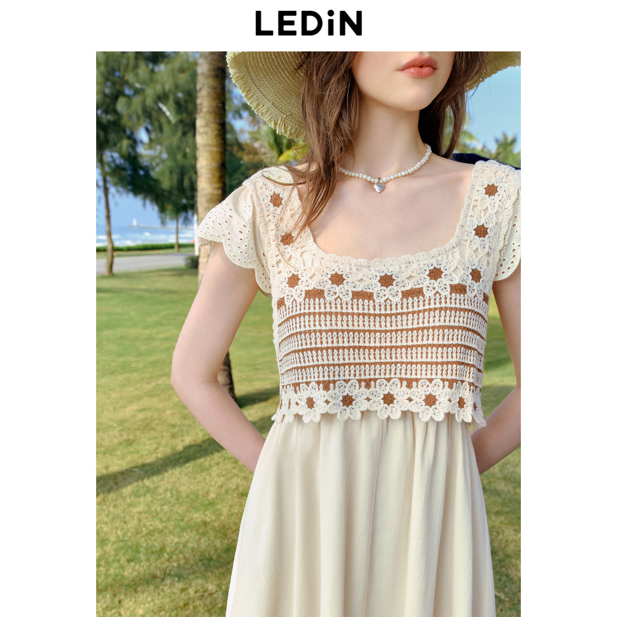 乐町甜美钩花拼接连衣裙年夏季新款假两件度假风小飞袖连衣长裙