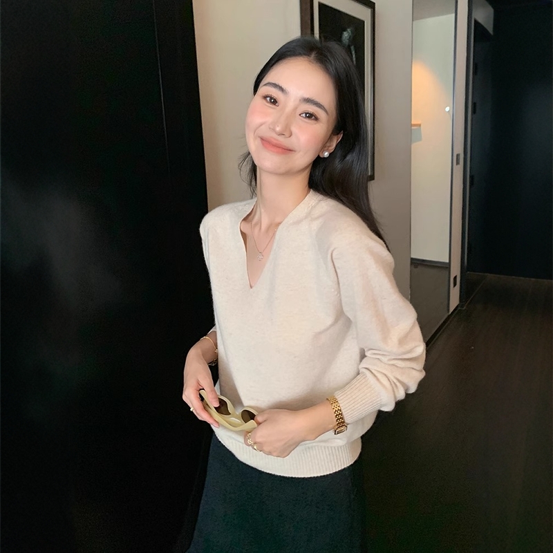 鄂尔多斯市羊绒衫女V领无缝秋冬纯色宽松套头毛衣羊毛针织打底衫
