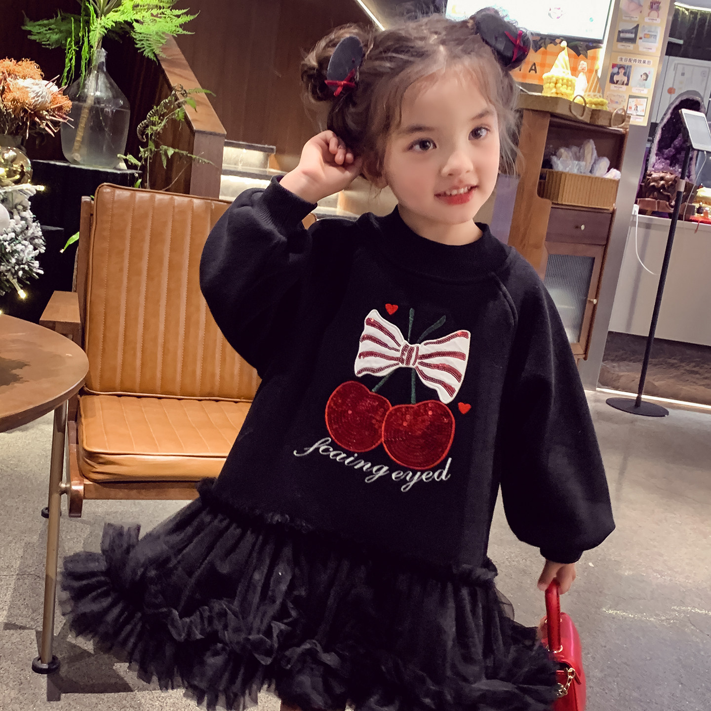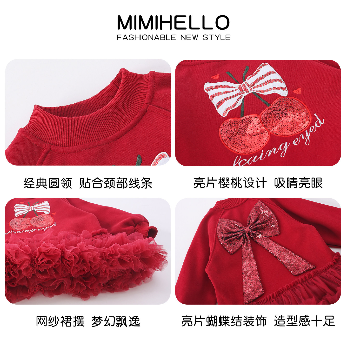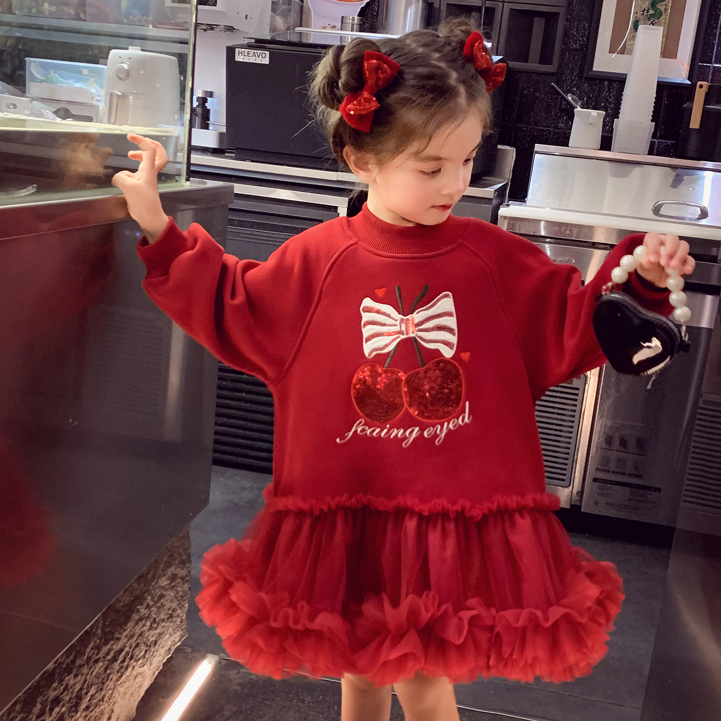 女童新年红色连衣裙冬装2025新款小女孩网纱加绒长袖卫衣蓬蓬裙子