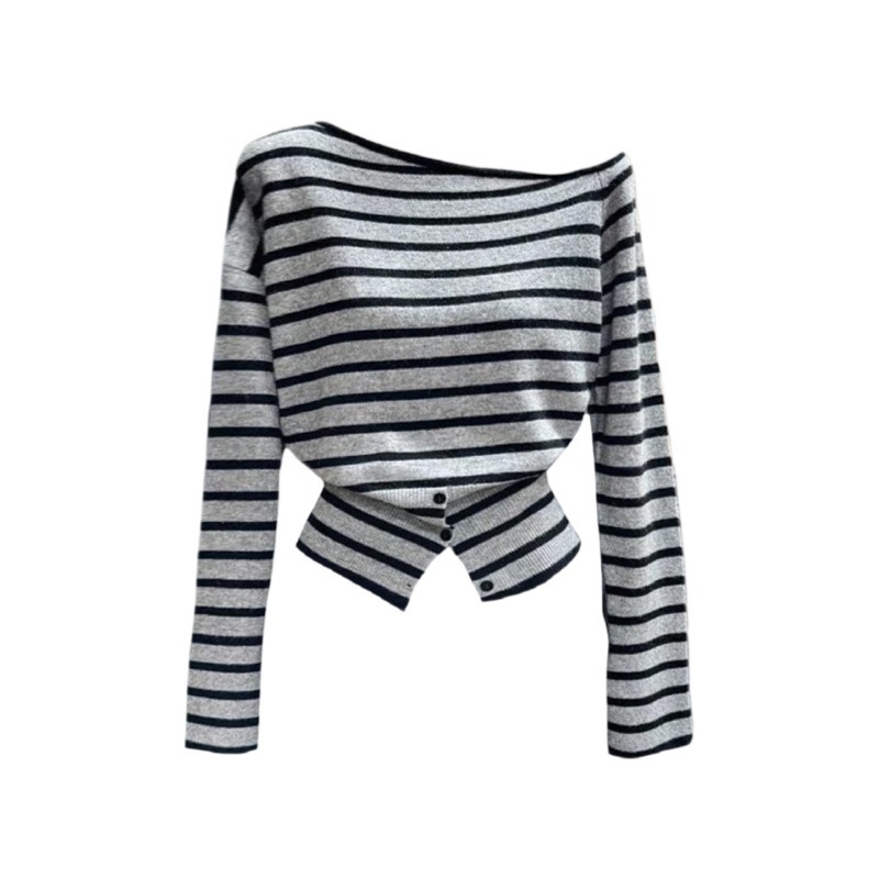 大码胖mm韩系辣妹条纹斜肩长袖t恤女秋季设计感修身显瘦露肩上衣