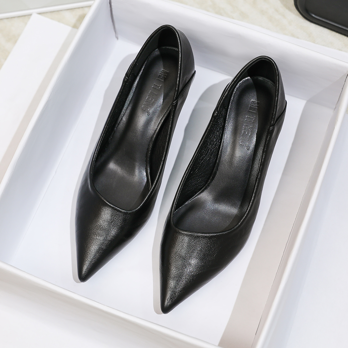 单鞋女黑色5cm细跟软底上班久站不累脚职业工作鞋软皮尖头高跟鞋