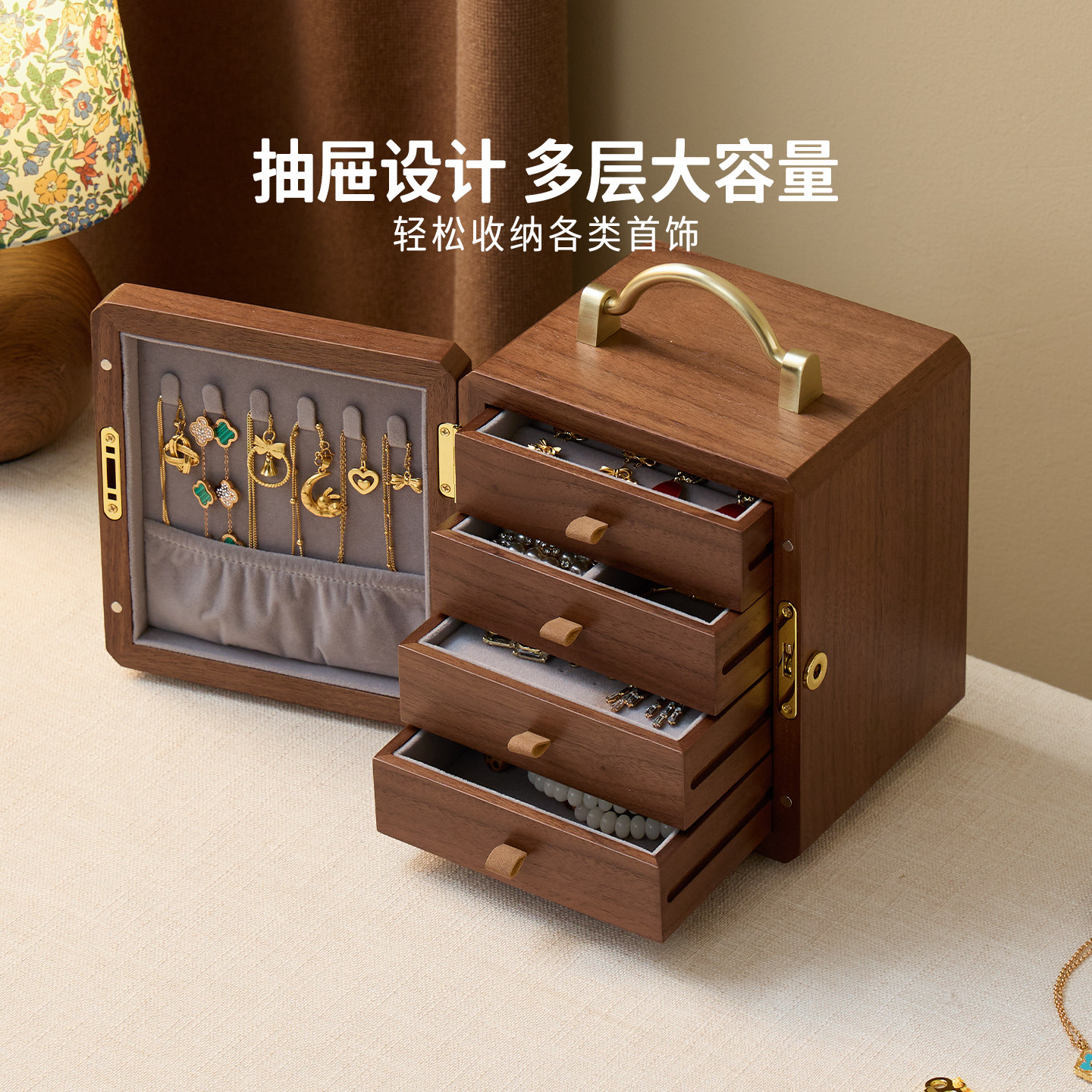 梵瀚实木质首饰盒带锁饰品收纳盒高档精致结婚新婚新年情人节礼物