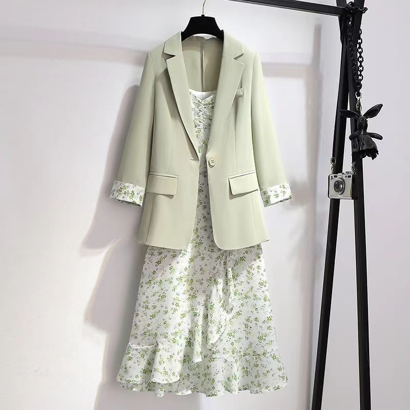 大码女装春秋洋气套装西装外套减龄碎花吊带连衣裙时尚气质两件套
