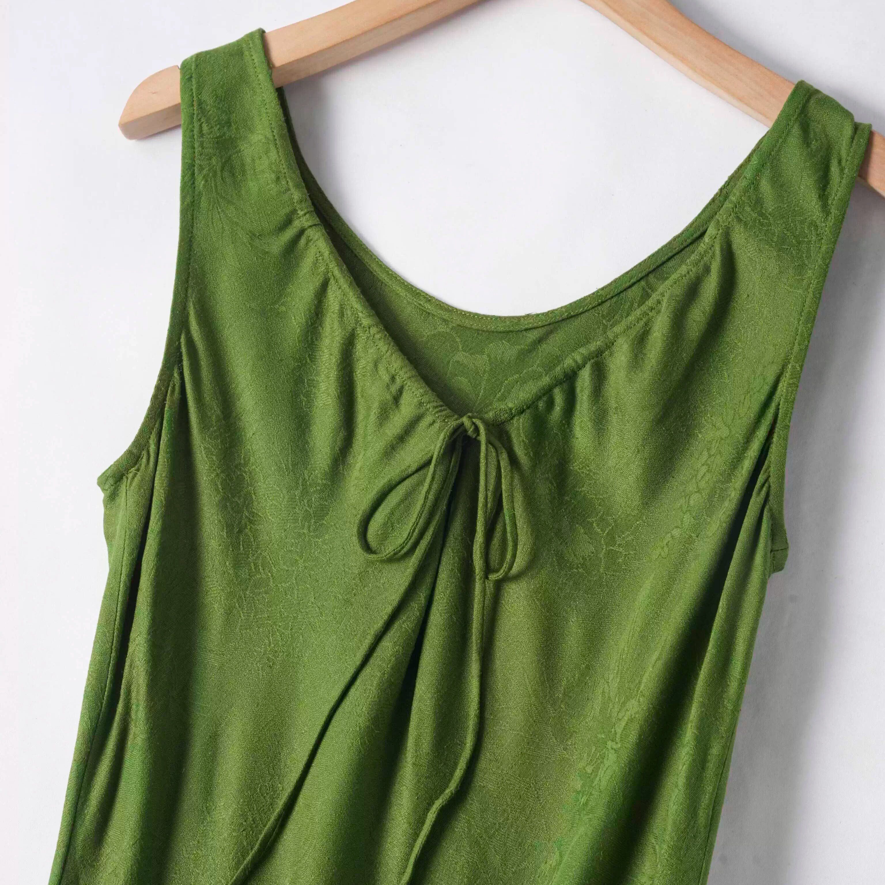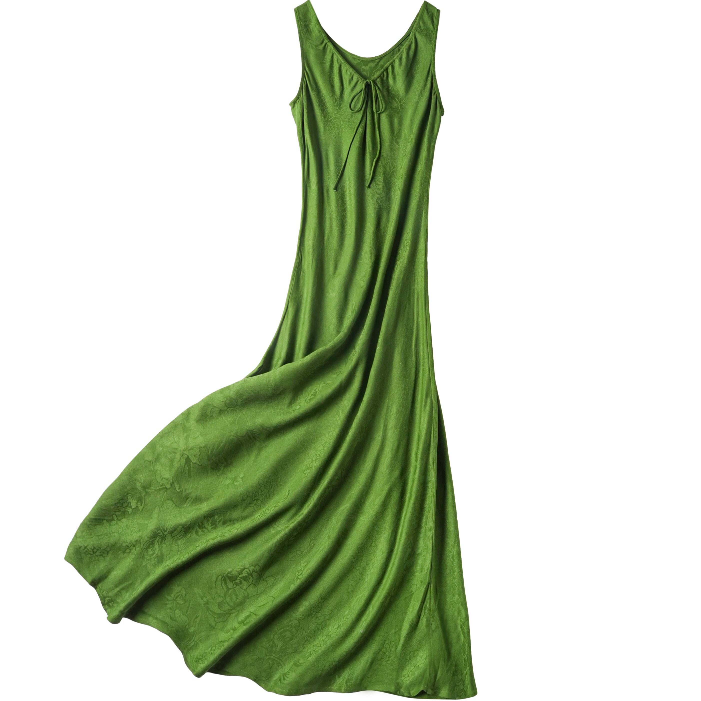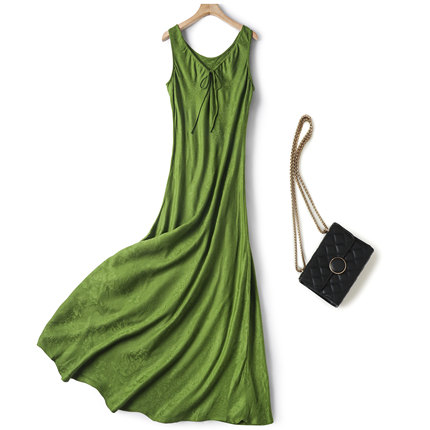 法式温柔风桑蚕丝裙子斜裁高级感提花真丝气质假日无袖连衣裙绿色