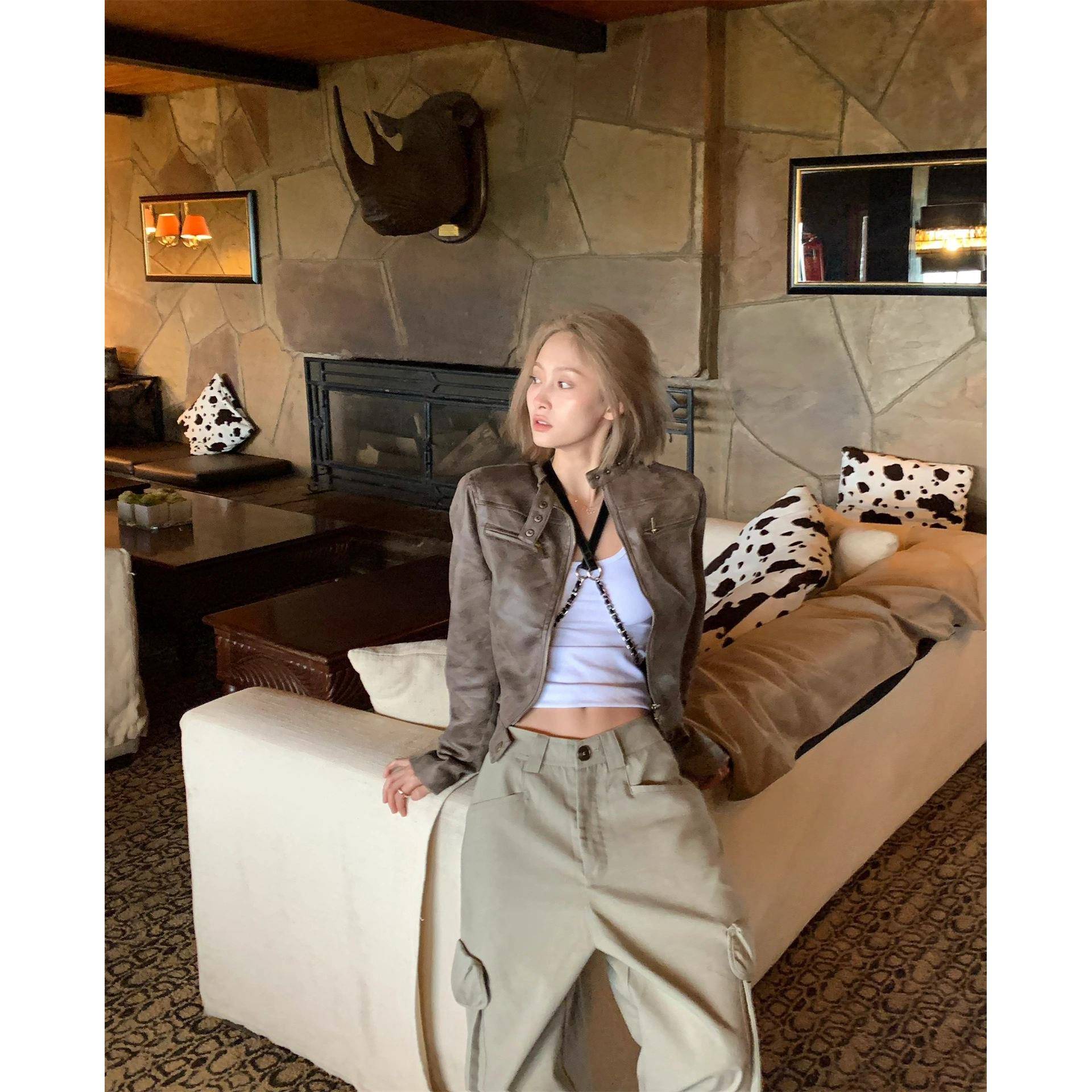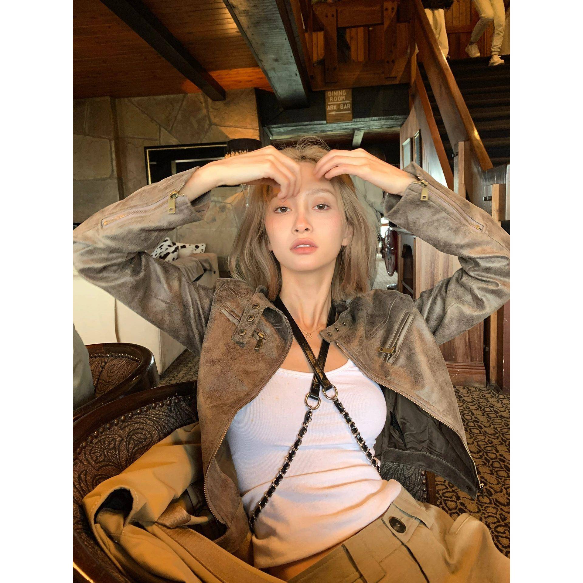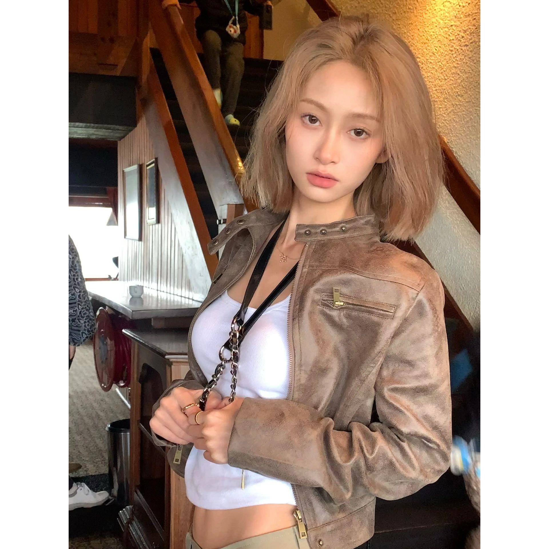 美式复古秋季短款机车服皮衣外套女早秋2024新款爆款咖色PU皮夹克