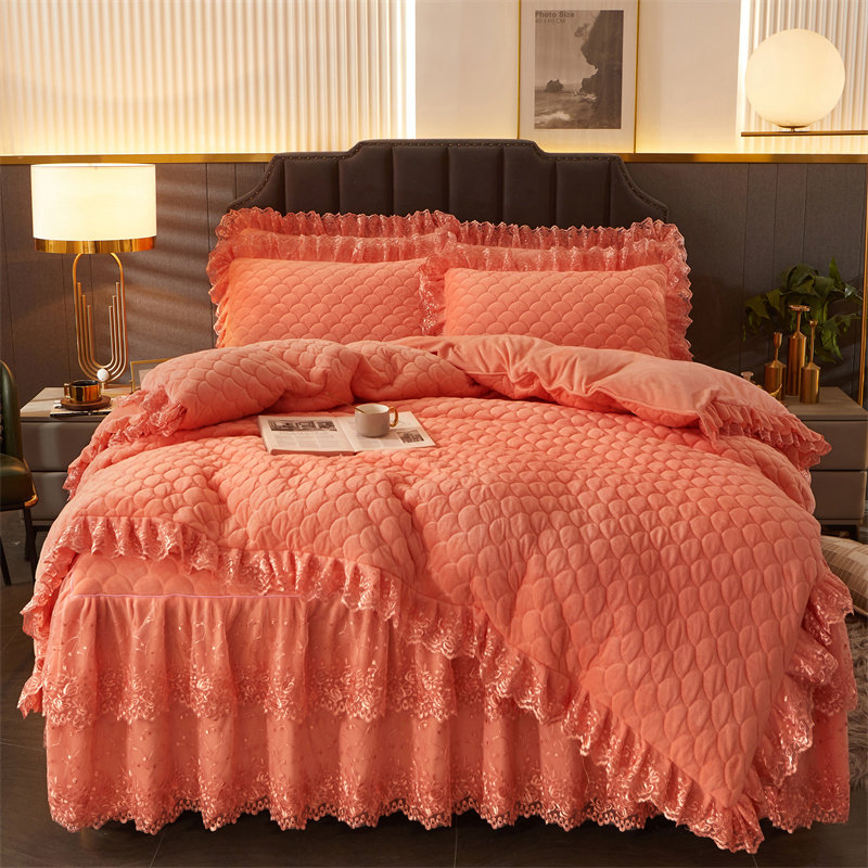加厚加绒法兰绒床裙四件套大红婚庆珊瑚绒床罩款被套保暖水晶绒