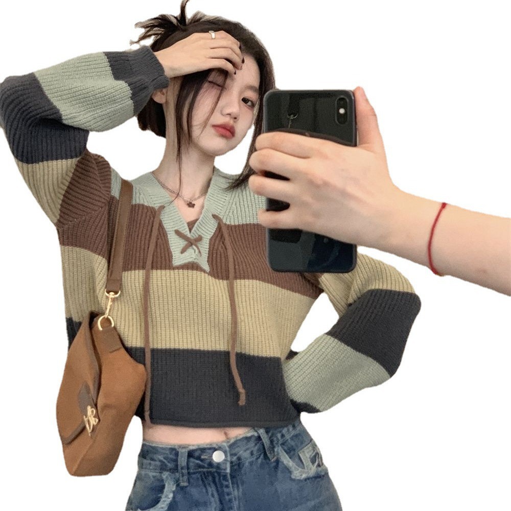 条纹撞色系带针织毛衣女2025春秋新款设计感翻领复古辣妹长袖