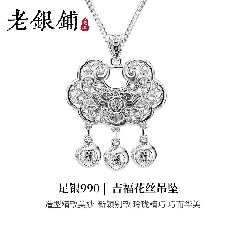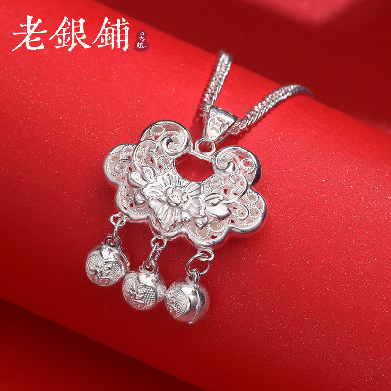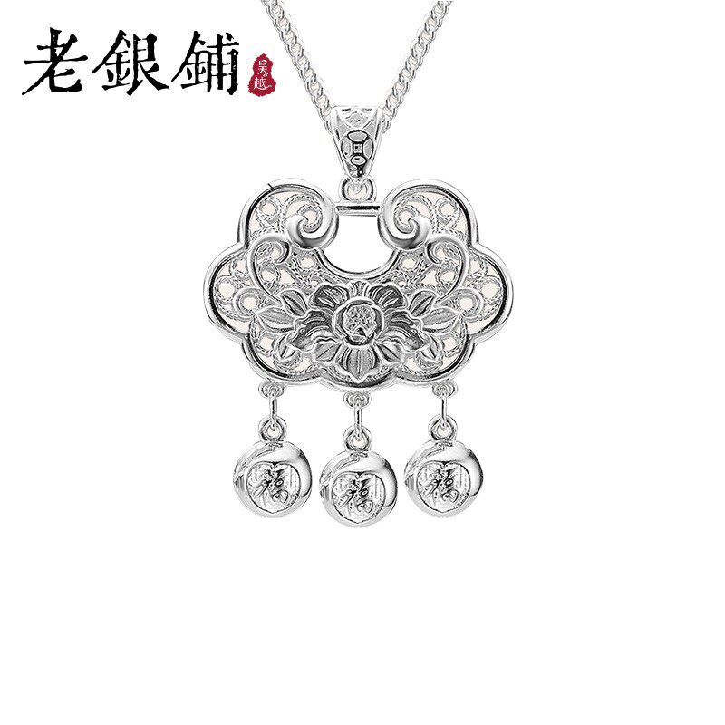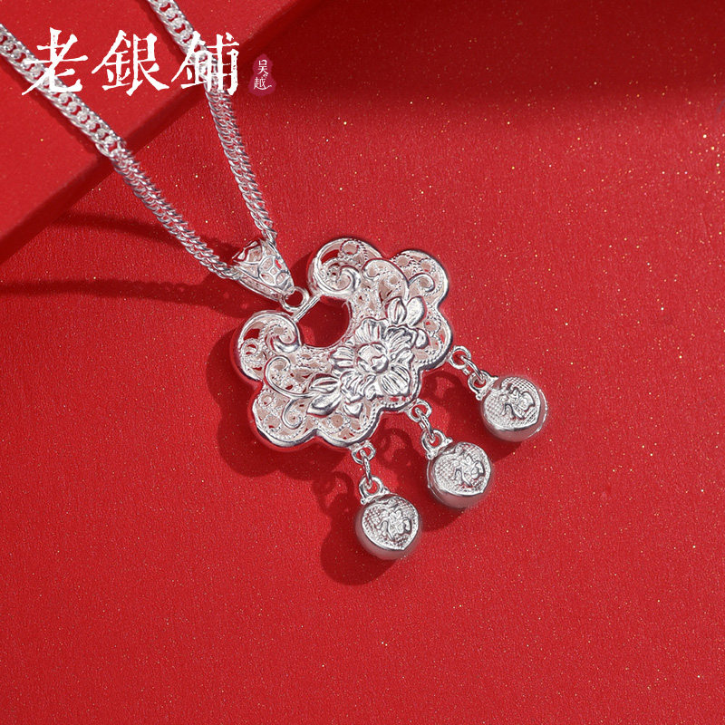 吴越老银铺足银990平安锁复古国潮长命福锁牡丹锁大人小孩通用