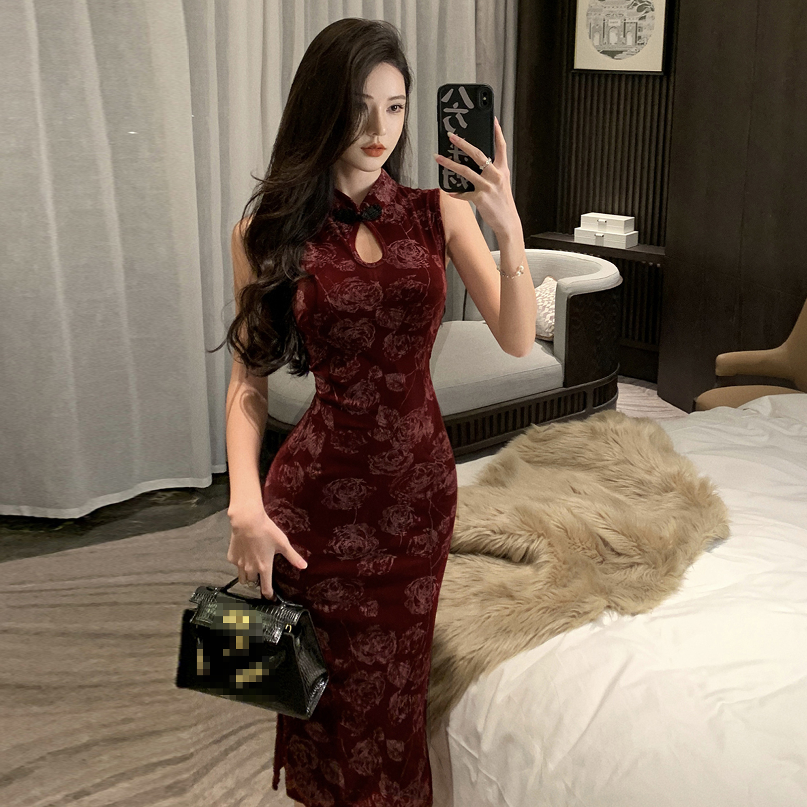 新中式国风改良旗袍长裙辣妹性感开叉包臀印花连衣裙红色新年穿搭