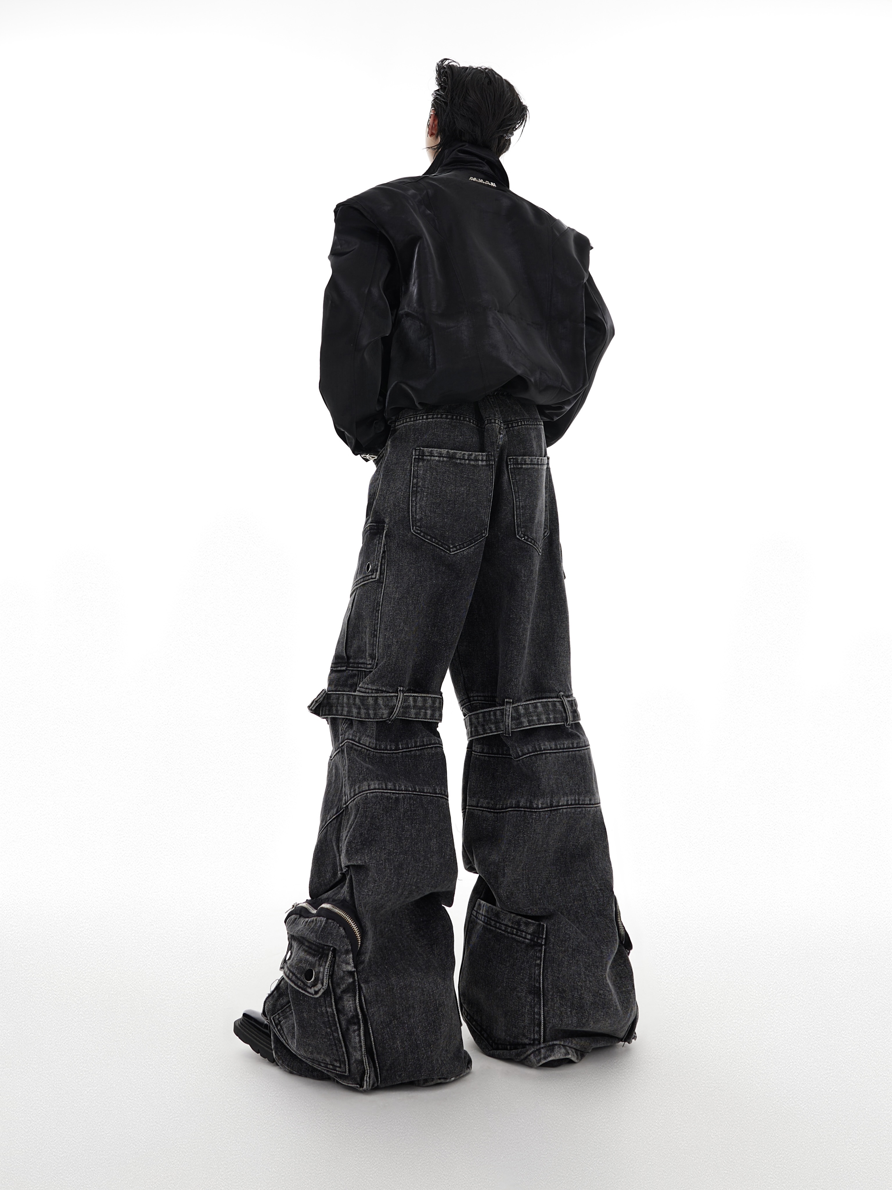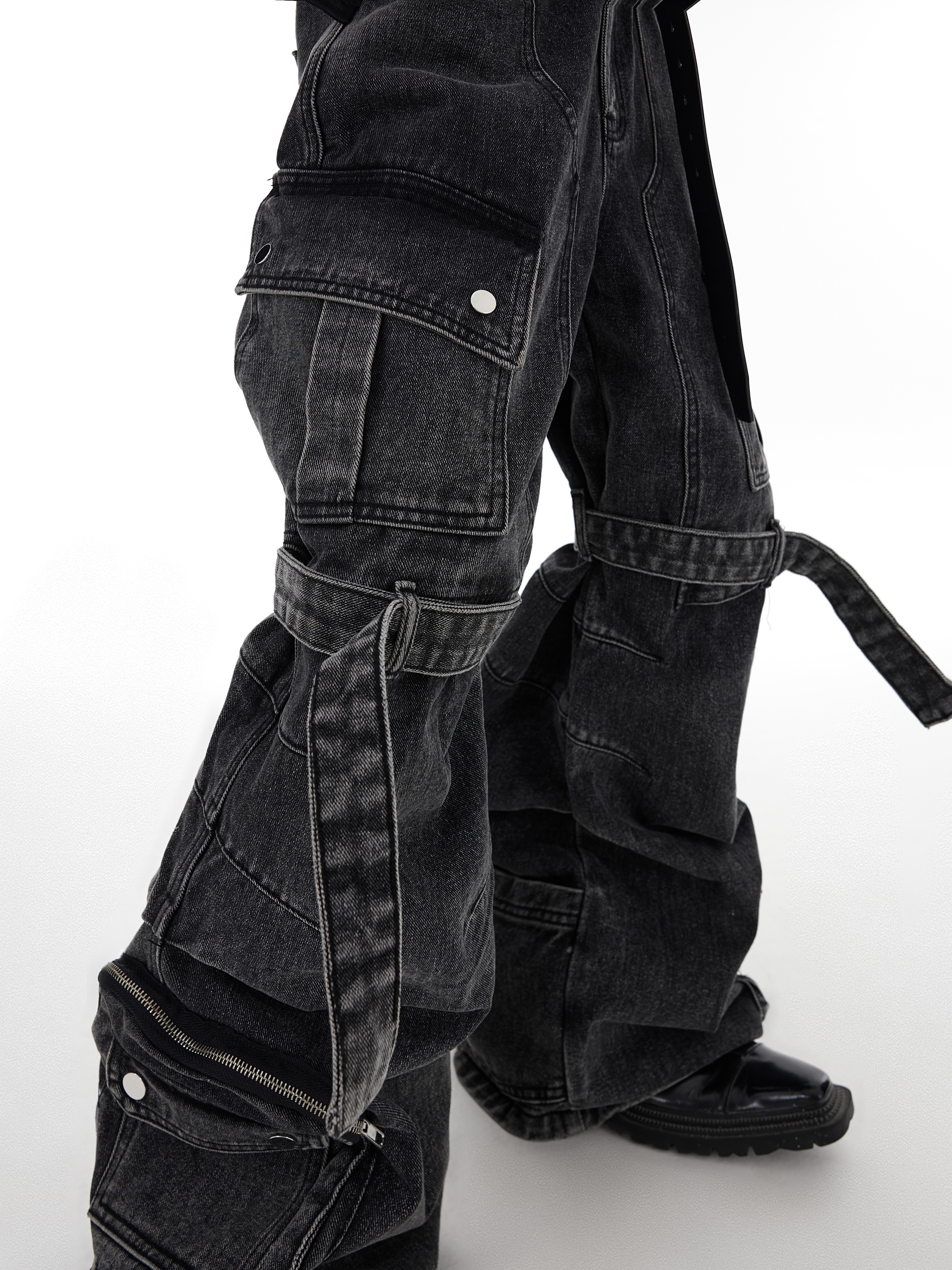 CulturE小众重磅水洗解构多口袋牛仔裤立体绑带设计感阔腿工装裤