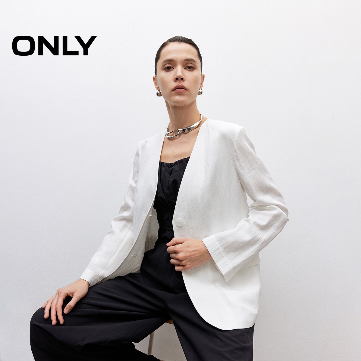 绫致ONLY2025夏季新款纯色正肩V领宽松显瘦长袖西装外套女