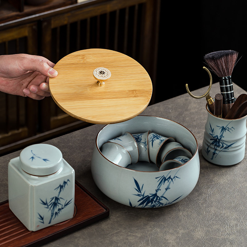 手绘茶洗有盖草木灰陶瓷水洗竹报平安水盂茶道配件装茶杯器皿茶缸