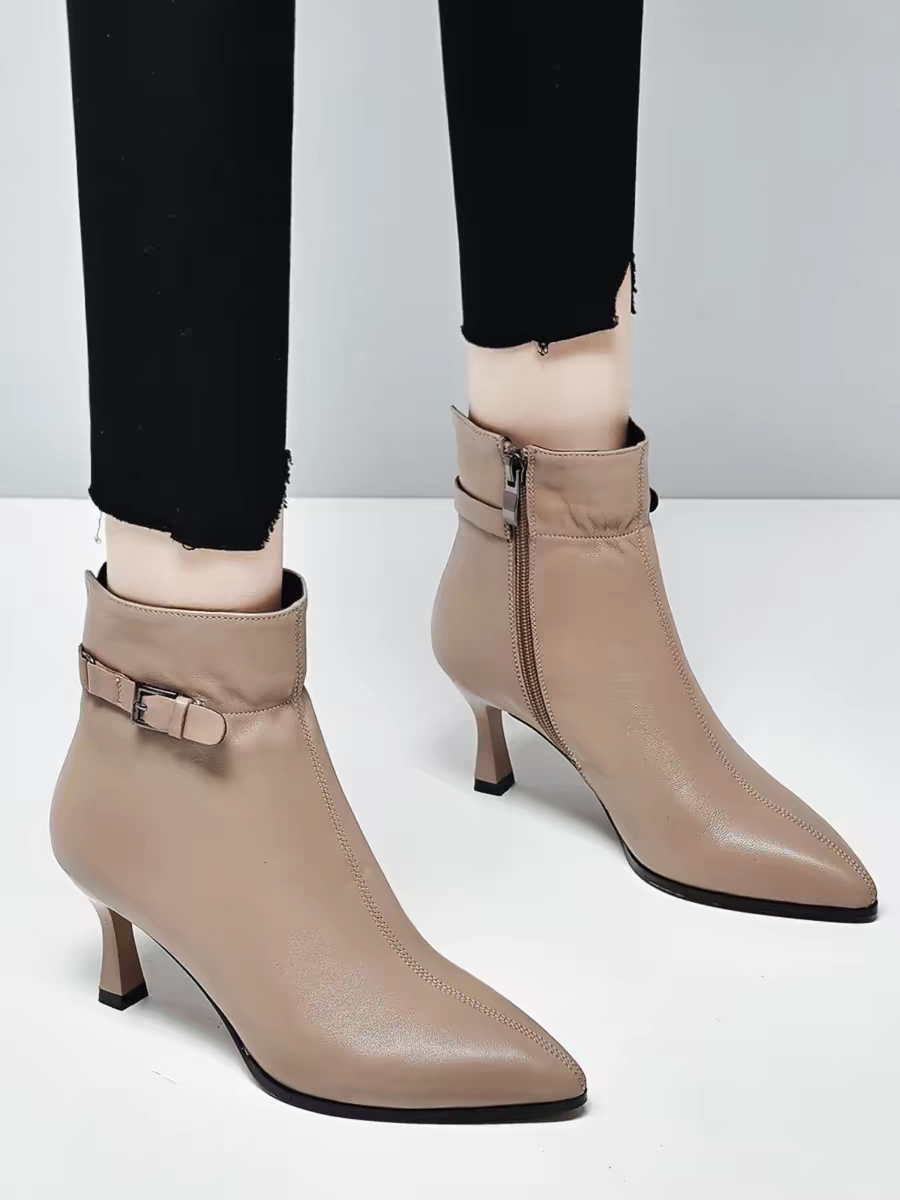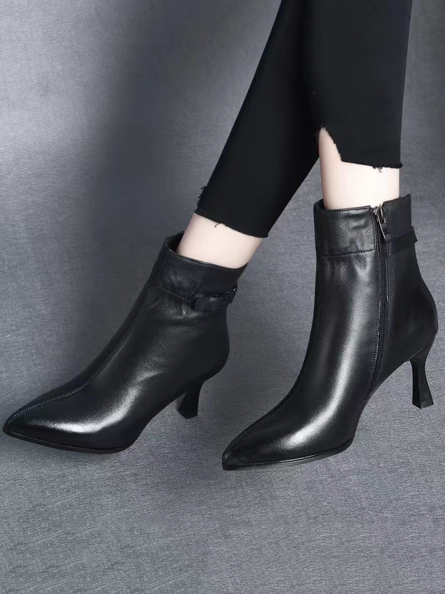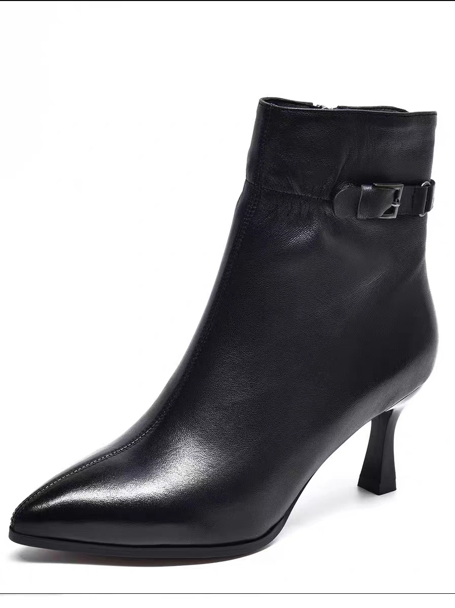 秋冬季新款真皮女鞋细跟尖头短靴橡胶软底加绒时装鞋