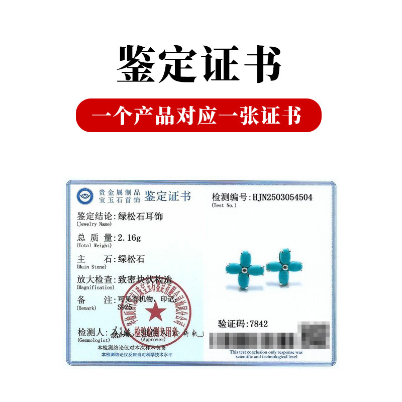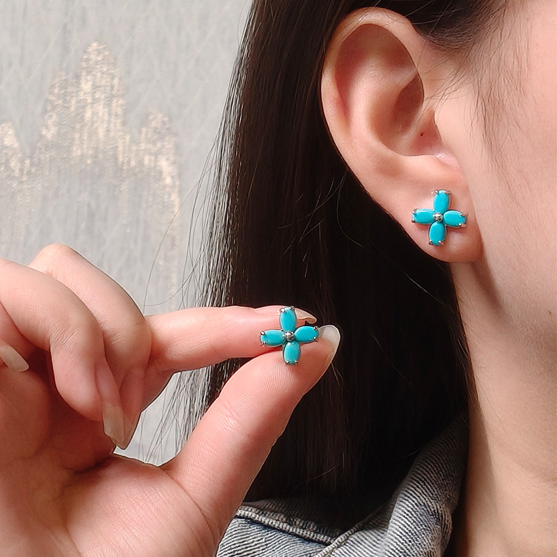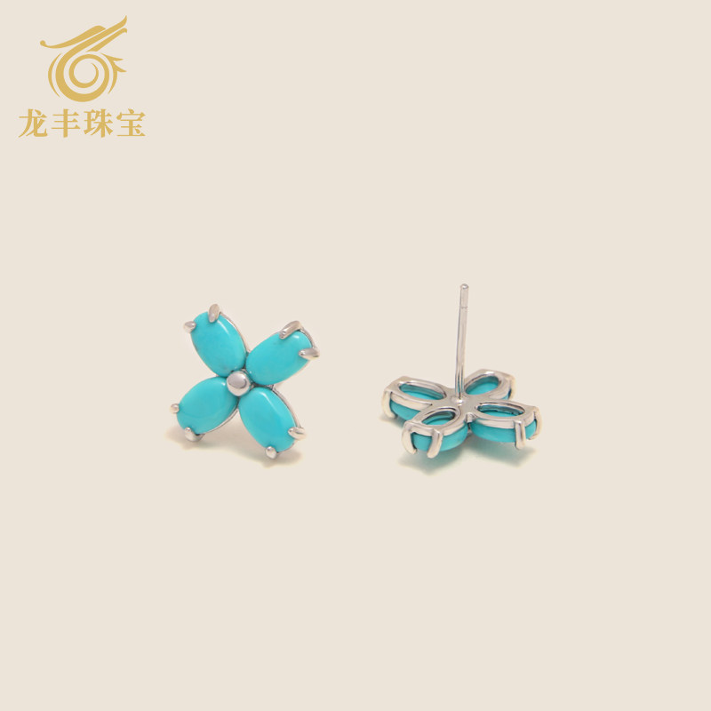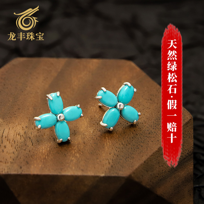 龙丰绿松轩S925银正品天然绿松石四叶草耳钉女款百搭耳饰