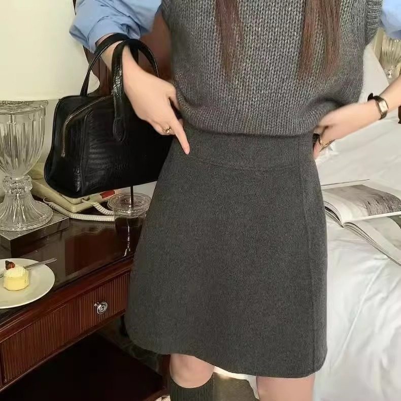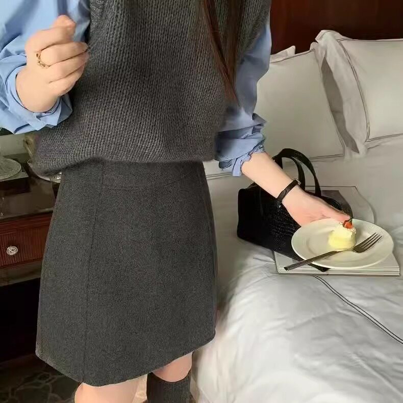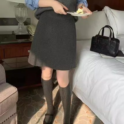 秋冬毛呢中裙加长款韩系高腰显瘦a字裙大码灰色高级感梨形半身裙