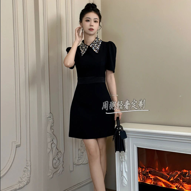 高定翻领千金风名媛气质连衣裙夏季重工精致设计师款a字小黑裙女