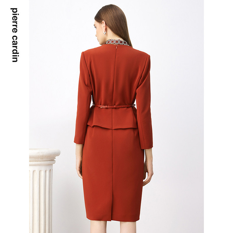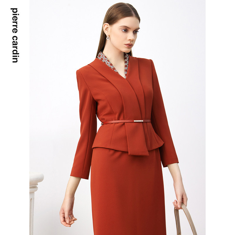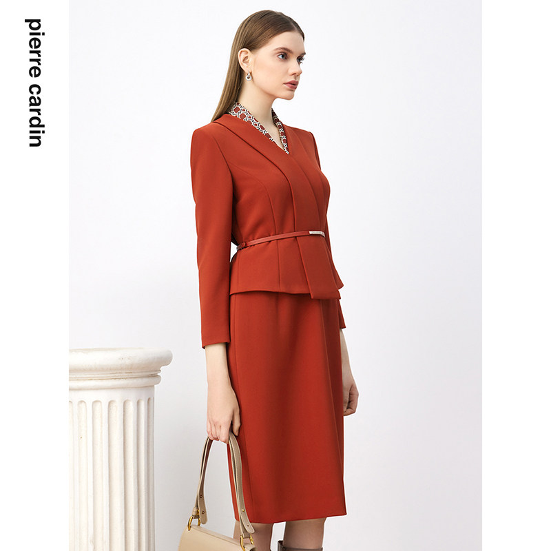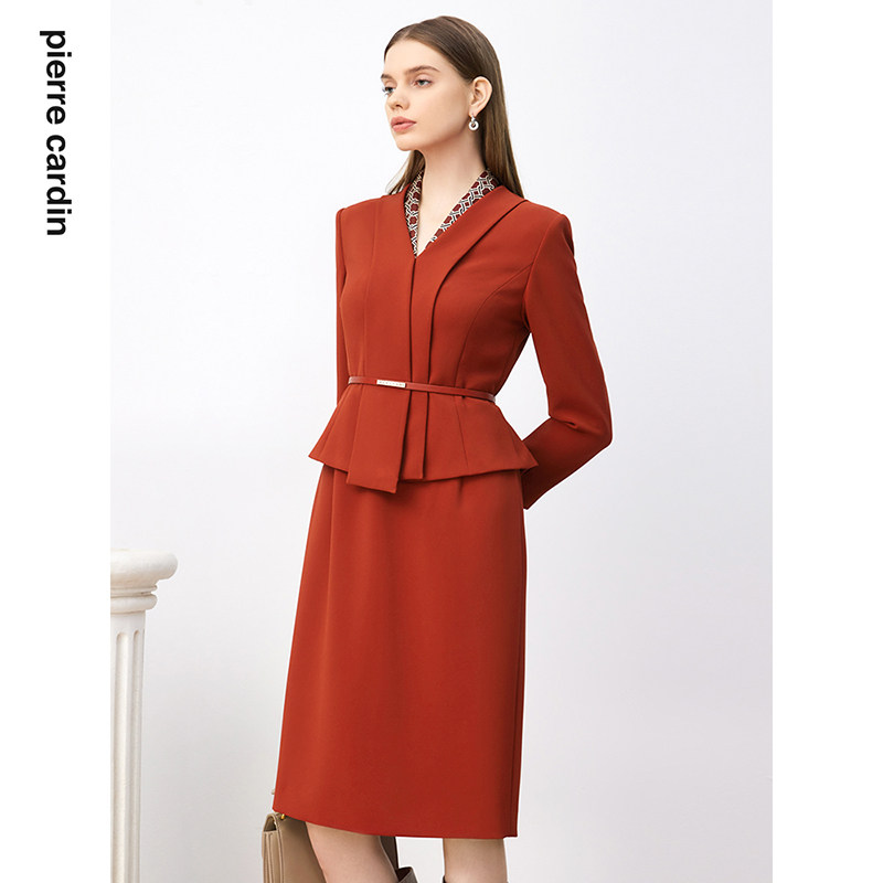 商场同款皮尔卡丹女装连衣裙秋季淑女拼接领通勤假两件连衣裙