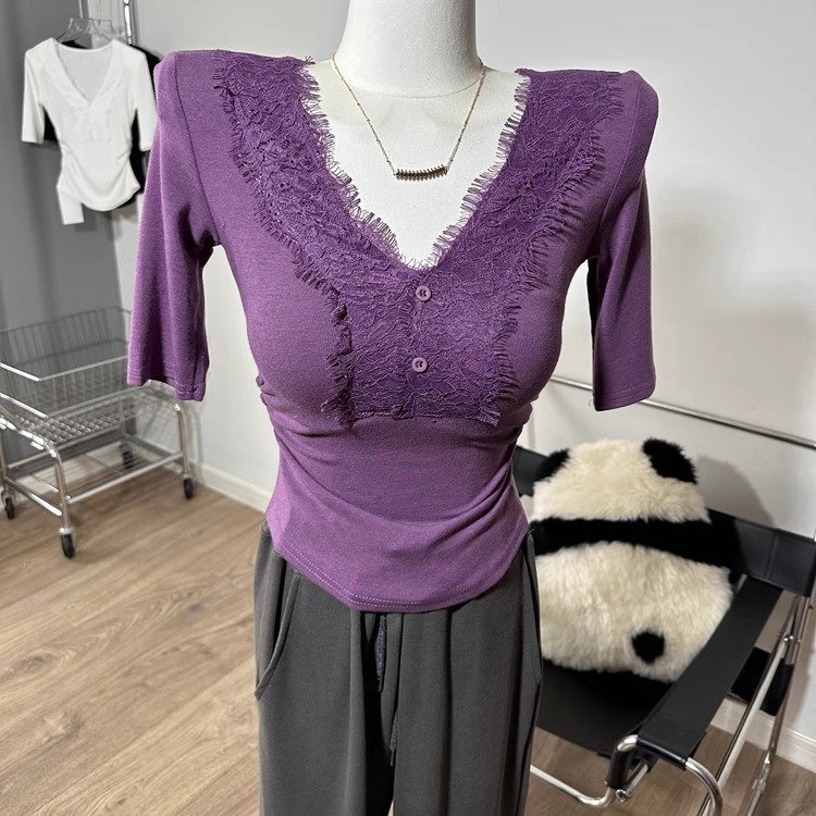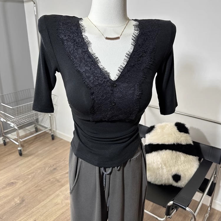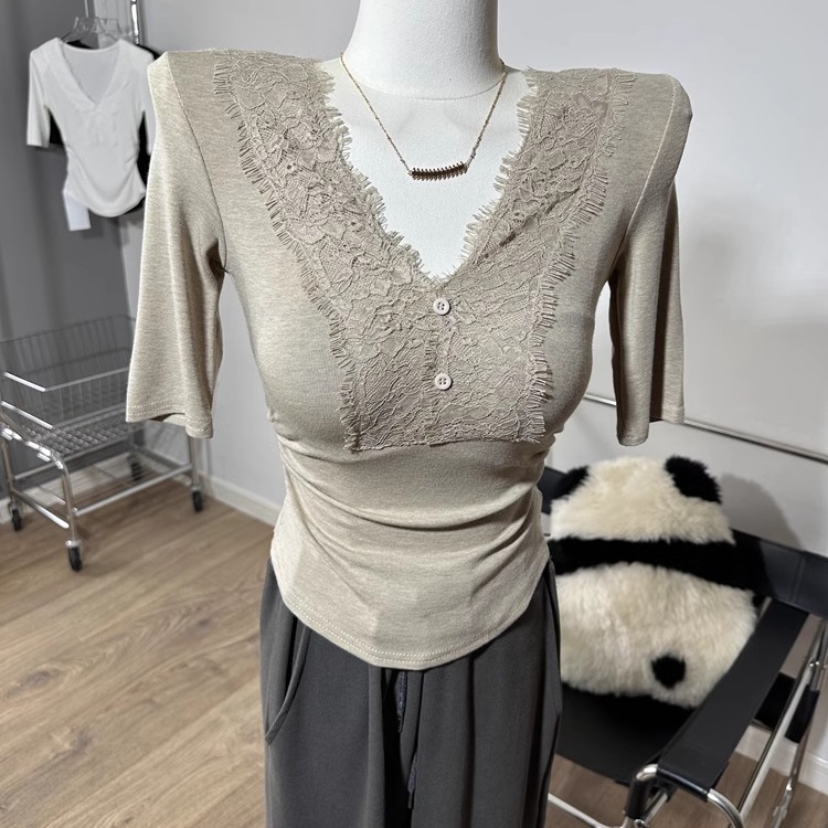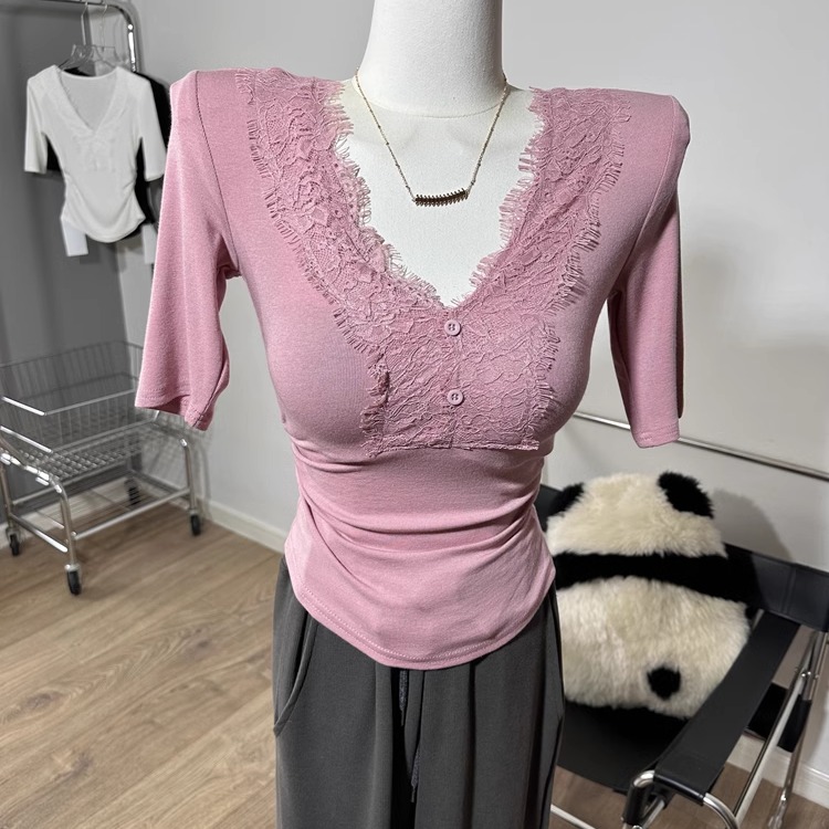 实物美!垫肩V领蕾丝边拼接中袖T恤修身褶皱五分袖打底衫上衣春夏