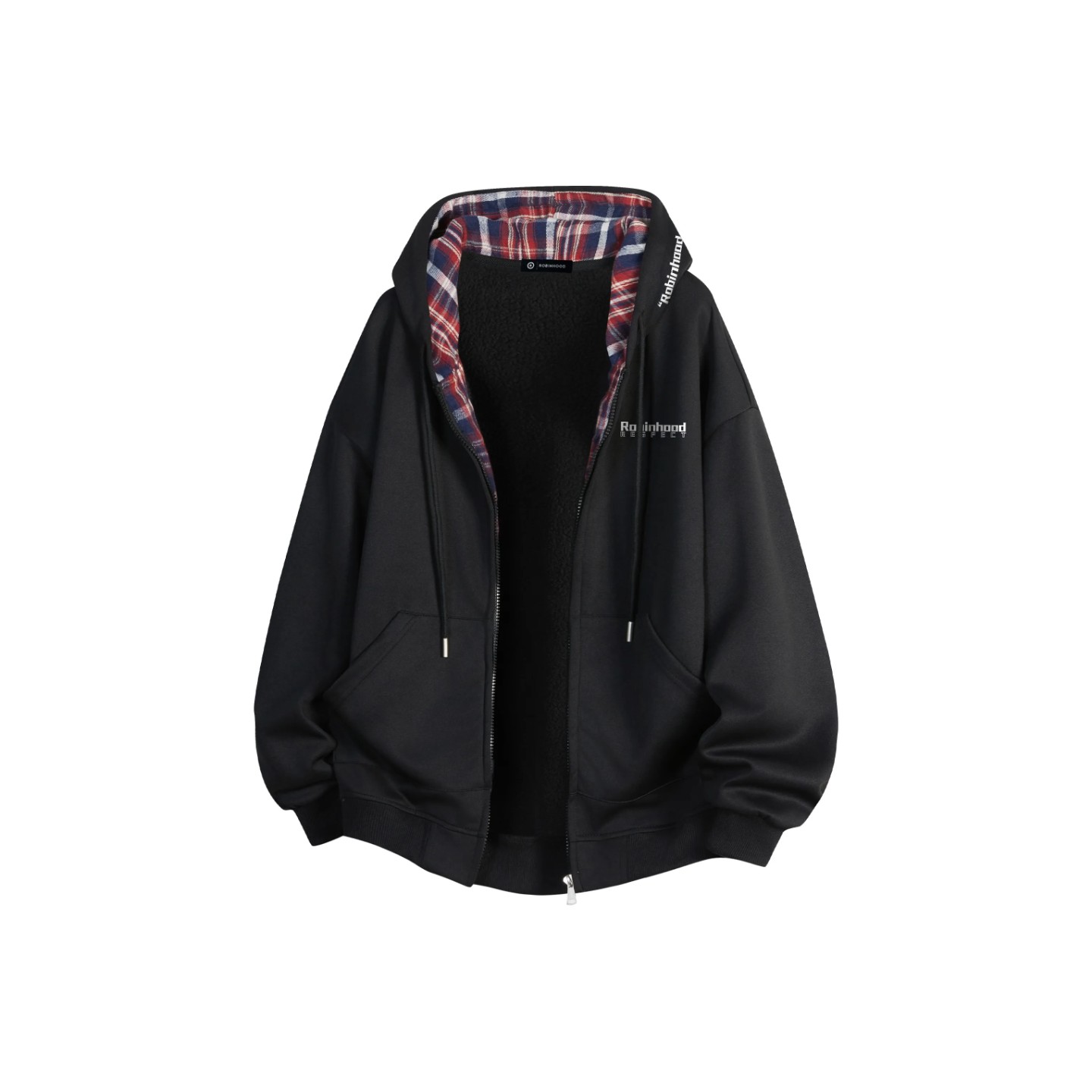 罗宾H帽檐艺术字母印花美式LOGO松紧袖口下摆连帽格子开衫卫衣