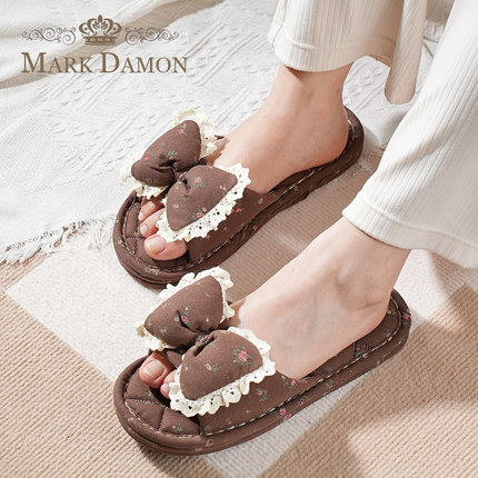 韩版蝴蝶结纯棉布艺蕾丝女居家防滑三层布底静音家居室内地板拖鞋