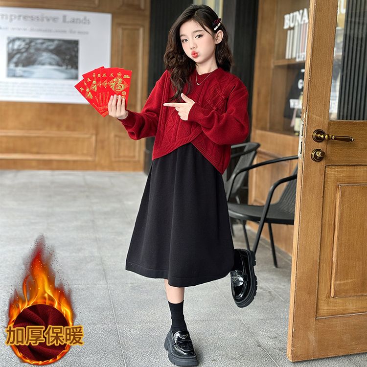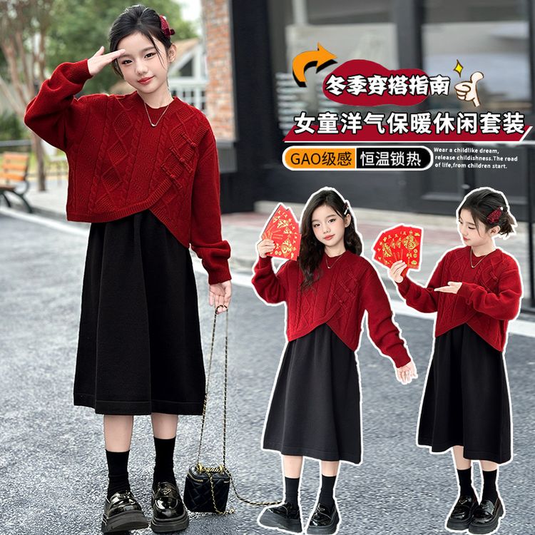 女童连衣裙秋冬款儿童裙子冬季小香风高级感大童套裙红色毛衣套装