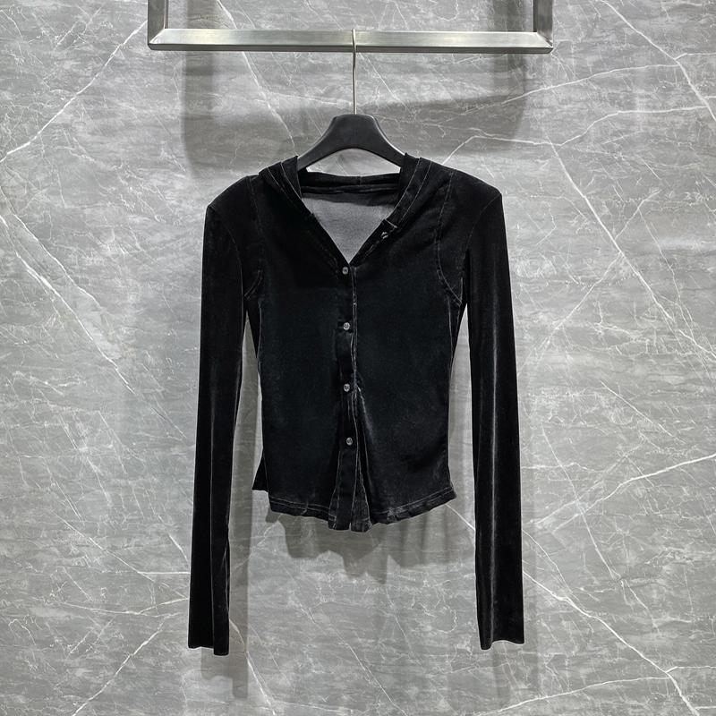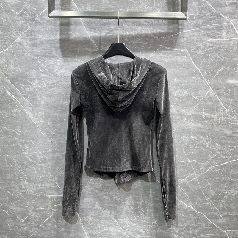 高级感丝绒2025秋季新款减龄单排扣连帽T恤百搭设计感轻奢上衣女