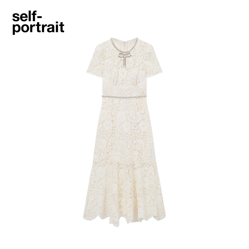 self-portrait 早秋象牙白甜美圆领钻饰蝴蝶结蕾丝连衣裙