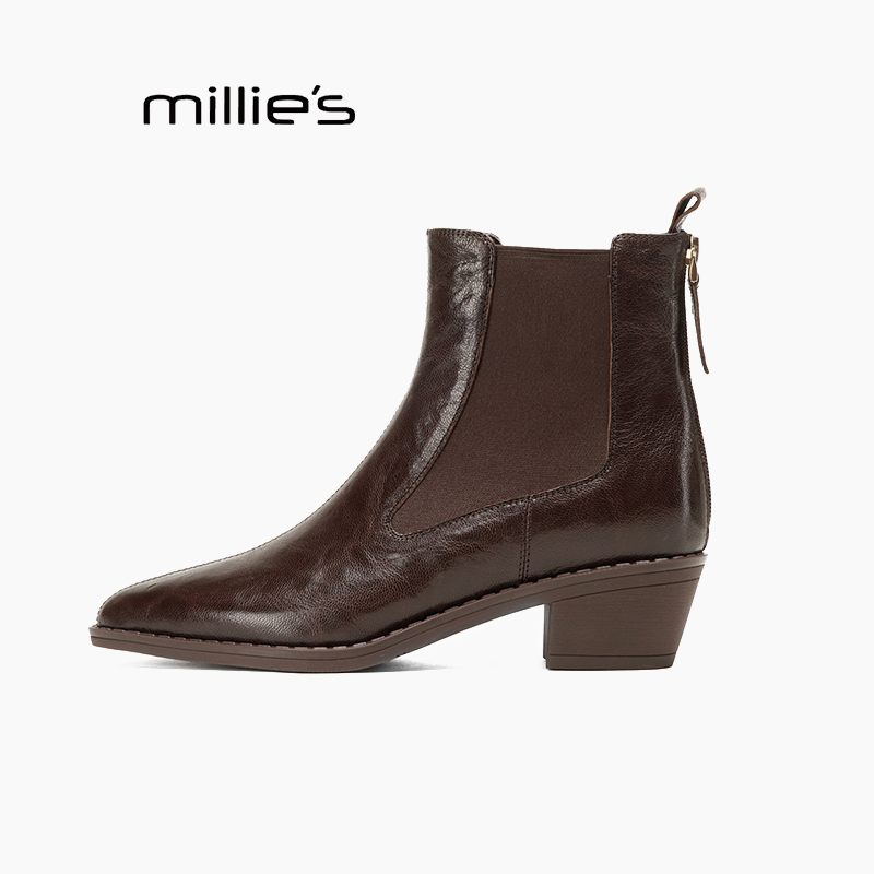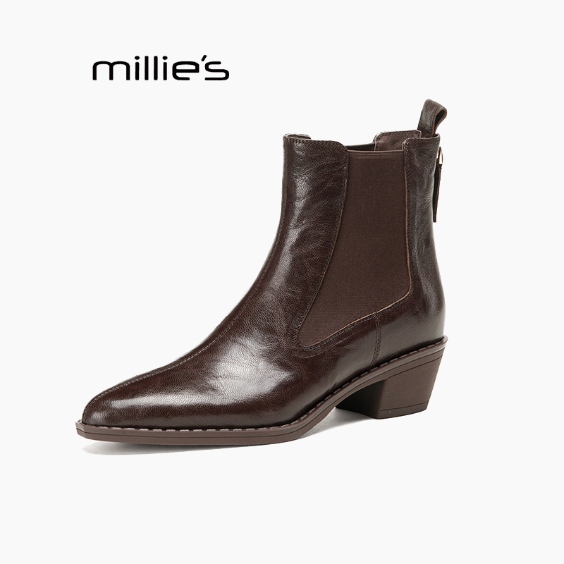 MILLIE'S/妙丽尖头及踝靴粗跟真皮气质套筒女高跟切尔西靴小短靴Z