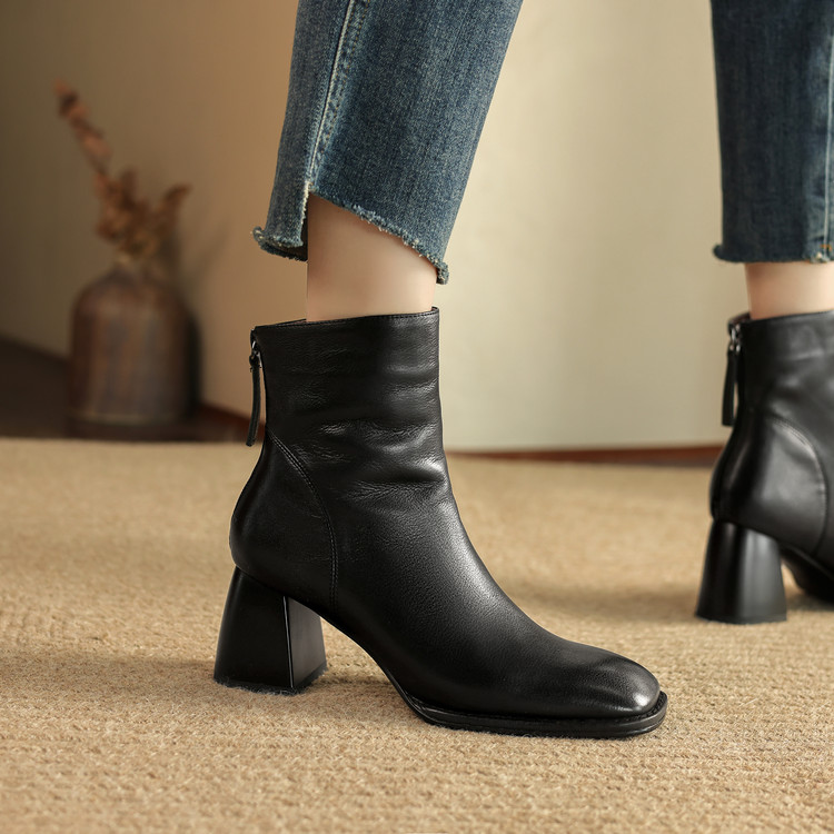 英伦高跟短靴女秋冬新款真皮复古单靴方头褶皱后拉链粗跟马丁靴子
