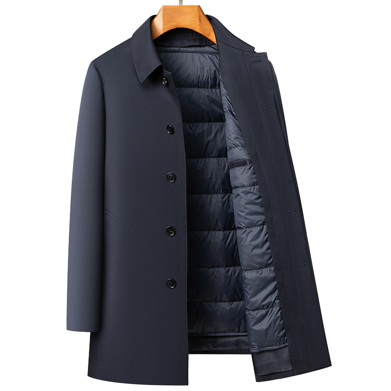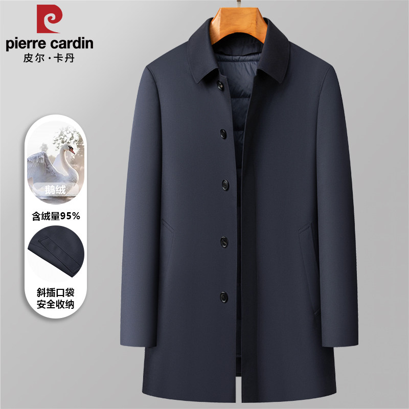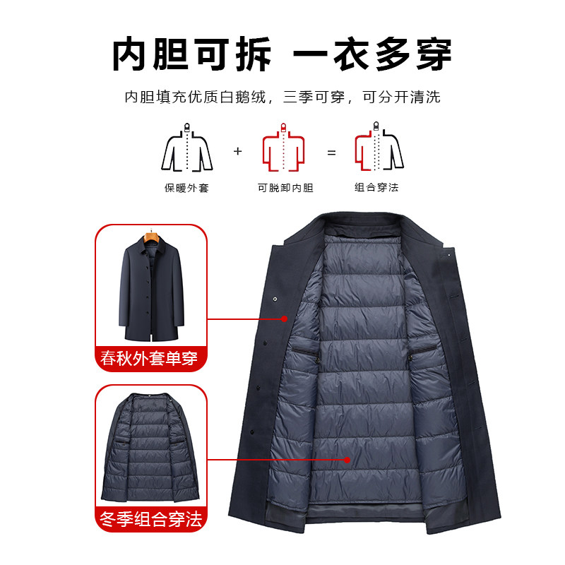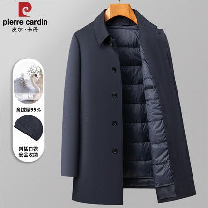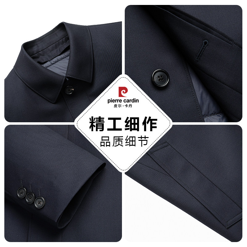 皮尔卡丹男士精纺羊毛桑蚕丝翻领中长夹克可卸鹅绒内胆外套爸爸装