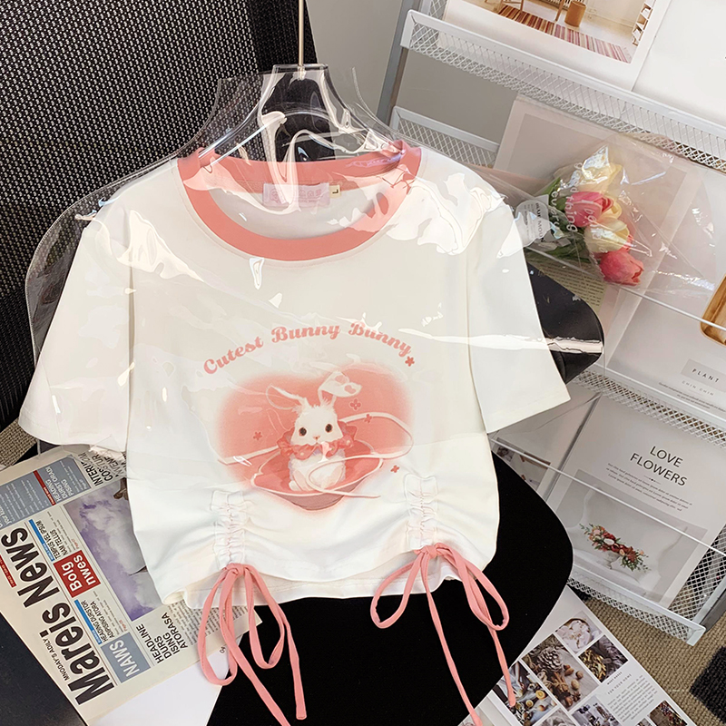 女童短袖T恤2023新款夏季女大童装宽松抽绳纯棉T恤儿童短款上衣