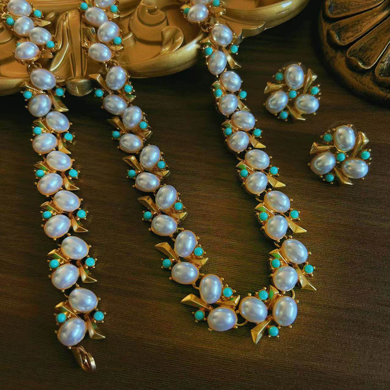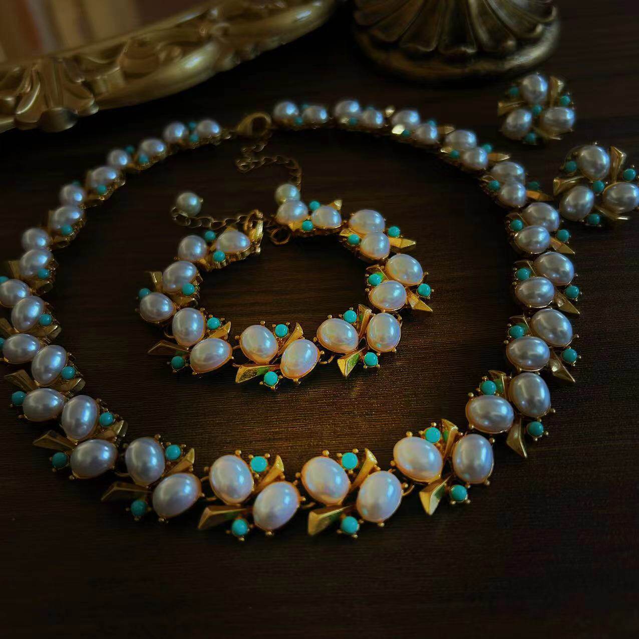 中古vintage感珍珠耳钉 古董杂志时尚气质珍珠项链手链套装项链