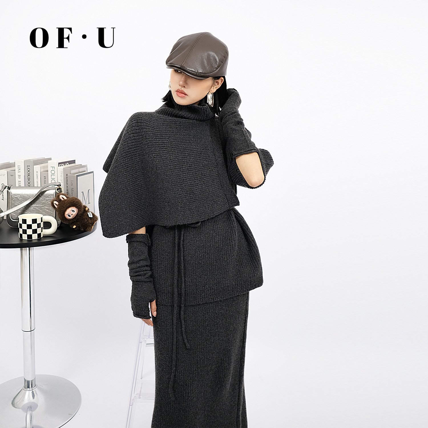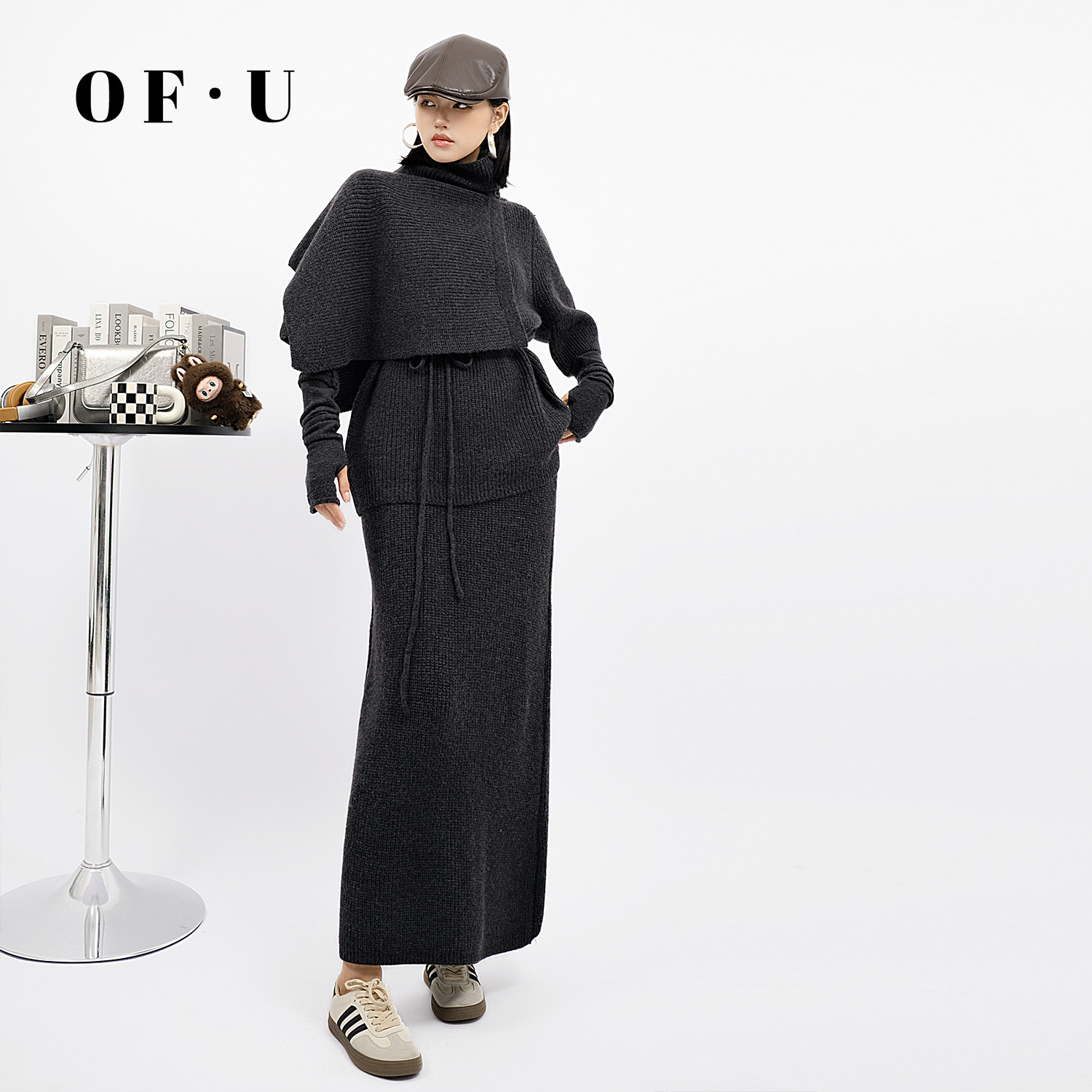 OF U老钱风深灰色套头披肩针织衫半身裙一整套女秋冬慵懒毛衣套装